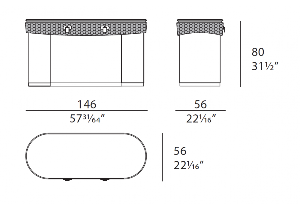 Vogue conçue par Andrea Bonini pour Turri est une coiffeuse avec structure en MDF, contreplaqué et panneaux de particules avec une finition brillante et un revêtement en cuir. Le plateau est en bois ou en marbre. Il y a trois tiroirs avec revêtement extérieur en cuir avec un motif hexagonal. Base et détails en métal doré.