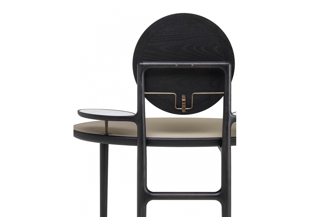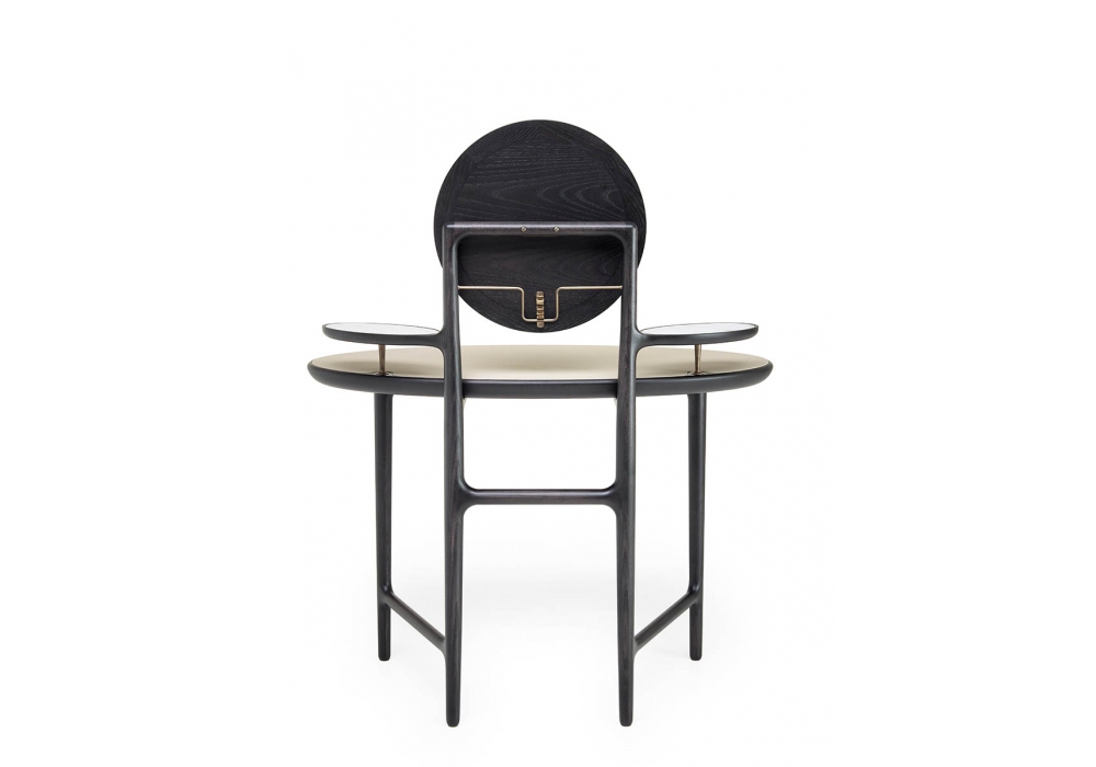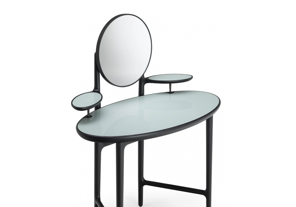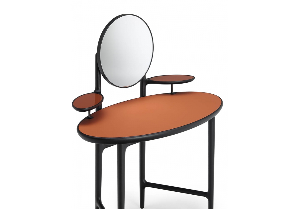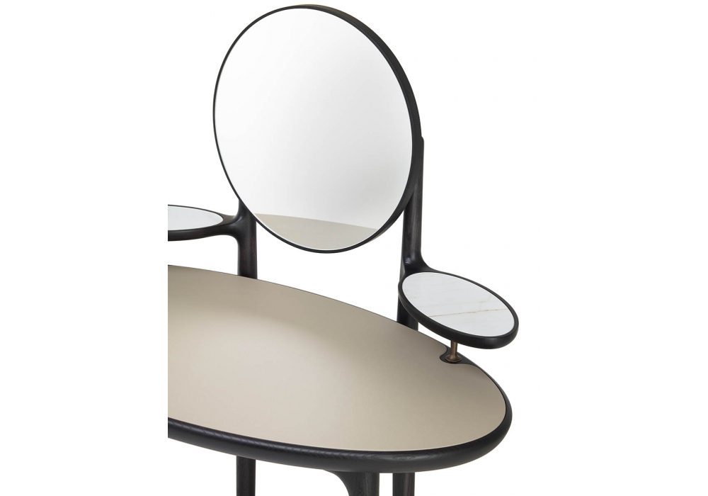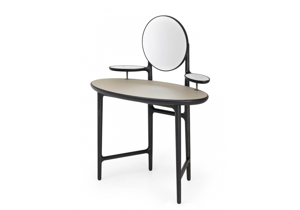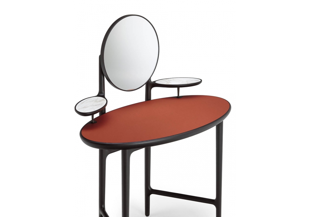 Duo conçu par Roberto Lazzeroni pour Poltrona Frau & Ceccotti Collezioni est une coiffeuse avec une structure en frêne massif. La silhouette délicatement incurvée de la coiffeuse DUO encadre un grand miroir rond inclinable, orné de détails en laiton, d'entretoises et d'un mécanisme de réglage. Le miroir est entouré de deux petites étagères encastrées. L'étagère centrale de la coiffeuse avec miroir, de forme elliptique, est disponible avec différents revêtements.