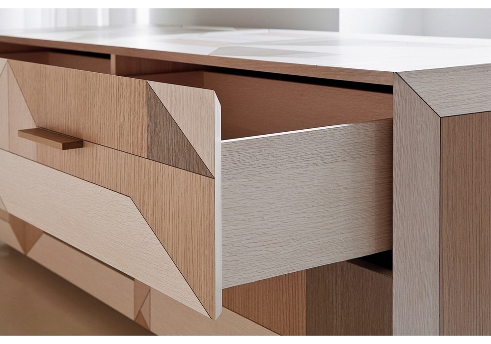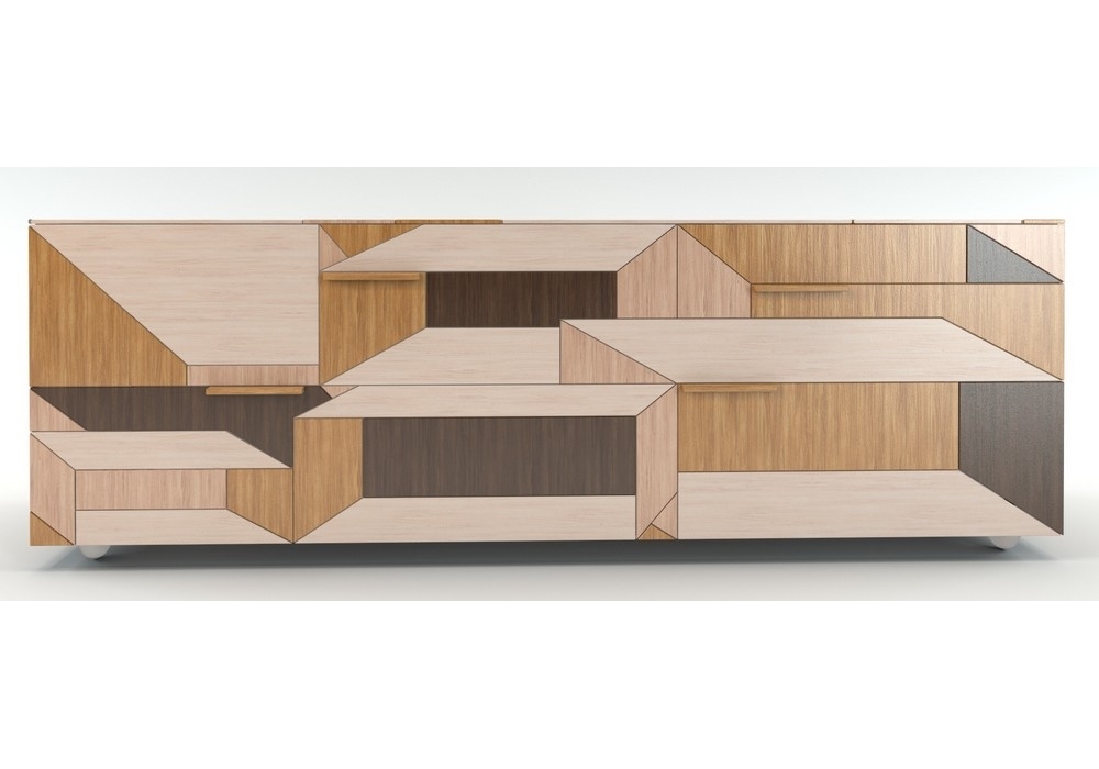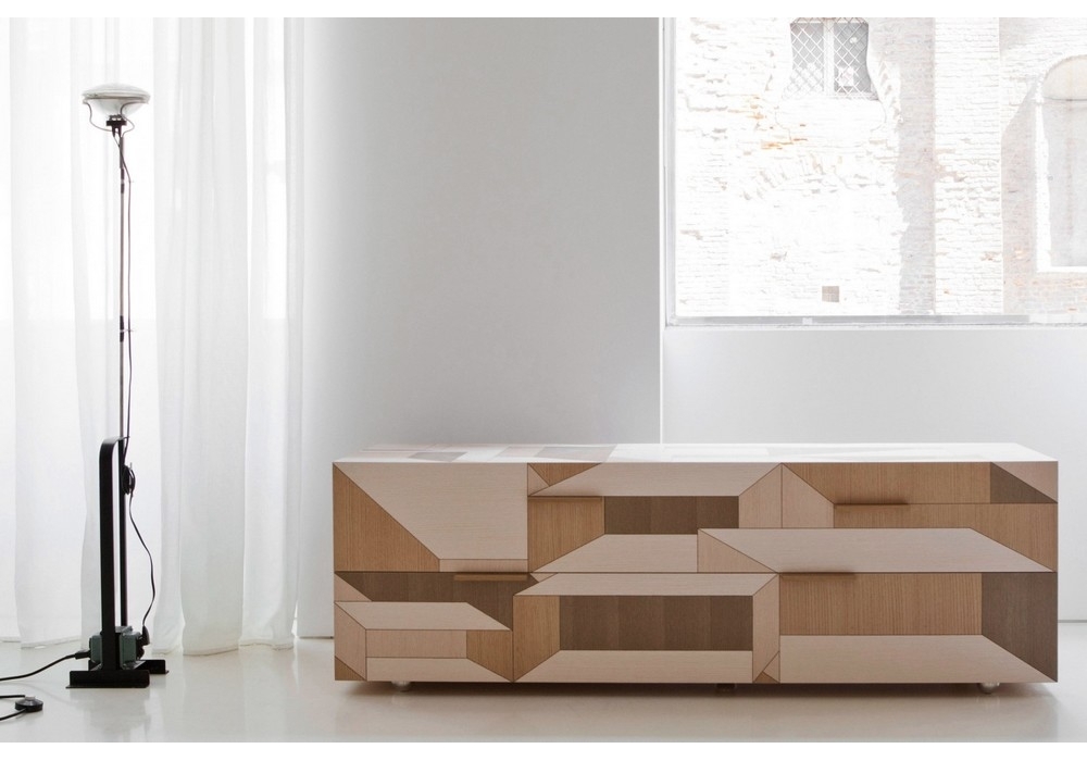 Inlay is a chest of drawers designed by Front for Porro. Inlay entirely recovers the inlay technique, an ancient and precious old time tradition. A chest of drawers with 2 drawers, covered with a decoration recalling parallelepipeds crossed in space, leading to a unique 3 D effect. Inlay is the result of an accurate processing technique, with 4 different oak colours and a black profile: a contour line separating the different faces of the texture while defining the design. The chest of drawers exhibits 2 drawers, fitted with 2 internal trays and a single front. The Inlay handles are in solid oak; the interior is in natural oak.