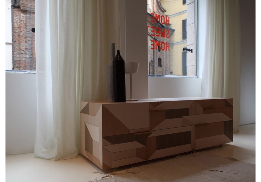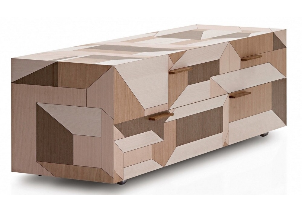 Inlay is a chest of drawers designed by Front for Porro. Inlay entirely recovers the inlay technique, an ancient and precious old time tradition. A chest of drawers with 2 drawers, covered with a decoration recalling parallelepipeds crossed in space, leading to a unique 3 D effect.