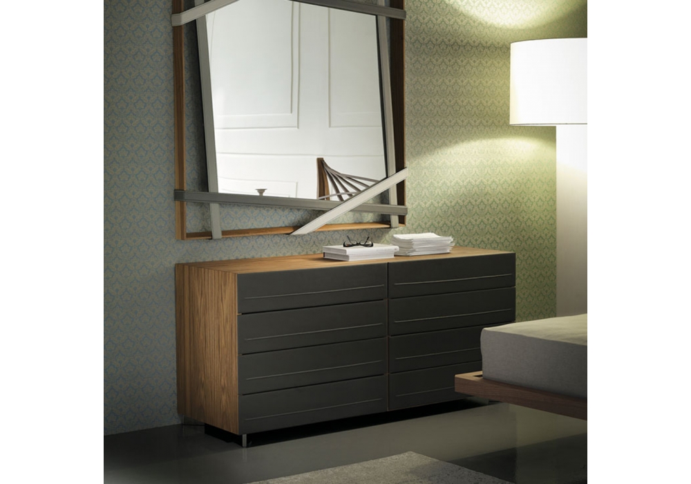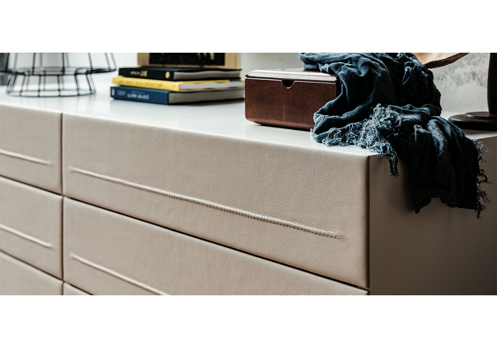 Dyno conçue par Paolo Cattelan pour Cattelan Italia est une commode avec structure en noyer canaletto, chêne brûlé ou en bois gaufré. Tiroirs avec revêtement avant en cuir ou cuir écologique. Pieds en acier inoxydable. Disponible avec 8 tiroirs.