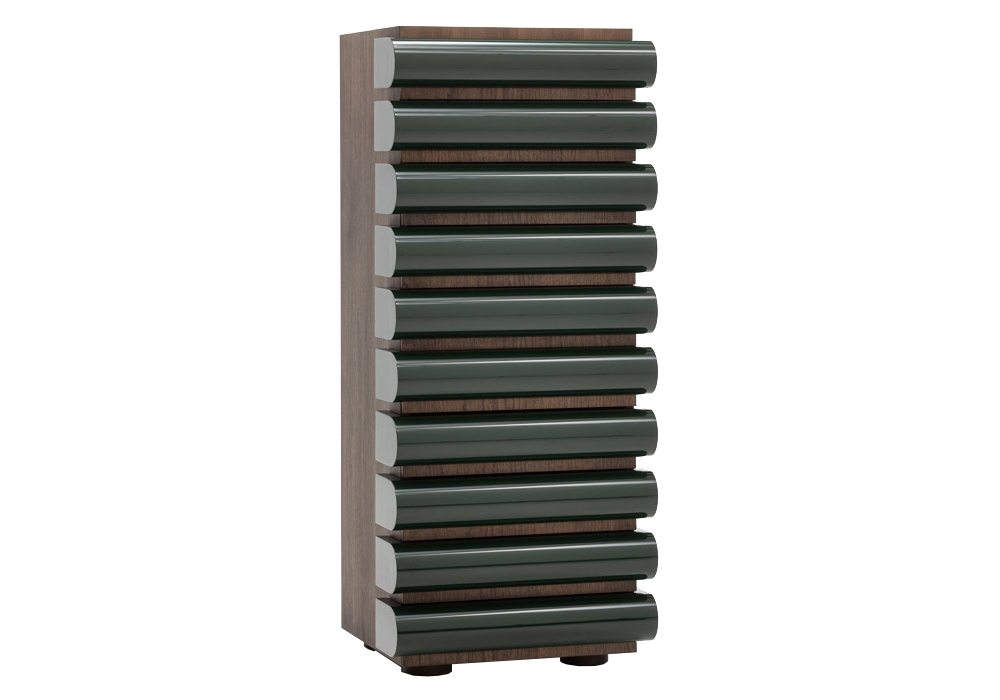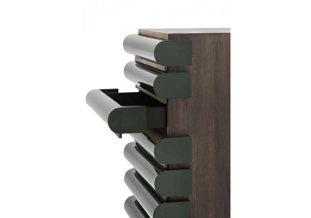 Storet conçue par Nanda Vigo pour Acerbis est une commode en frêne noir ou structure en noyer teinté foncé et des tiroirs en laqué brillant disponible en différentes couleurs.
