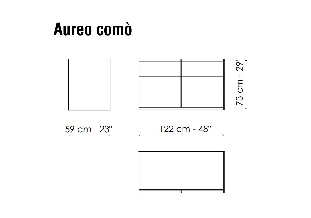Aureo conçue par Matteo Nunziati pour Bonaldo est une commode avec plateau en céramique, en différentes finitions. Les tiroirs sont en bois plaqué noyer canaletto, la structure latérale est en métal peint bronze et la structure latérale est en bois laqué bronze mat.