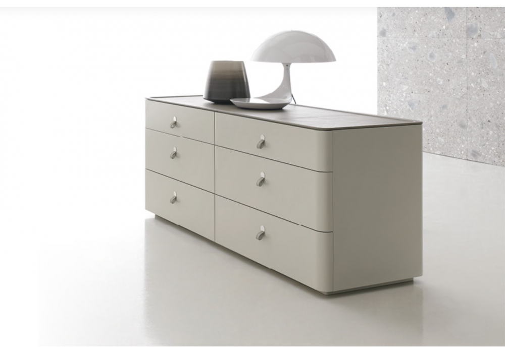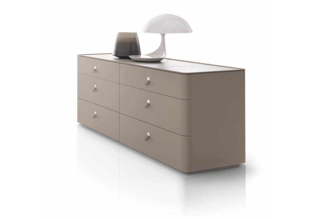 Kube conçue par Giuseppe Bavuso pour Alivar est une commode réalisée avec une structure en chêne peint ou traité thermiquement ou en MDF laqué mat. Plateau en pierre acrylique recouvert de cuir. Tiroirs avec guides métalliques de freinage. Façade en chêne peint ou traité thermiquement ou en MDF laqué mat. Poignées en cuir.