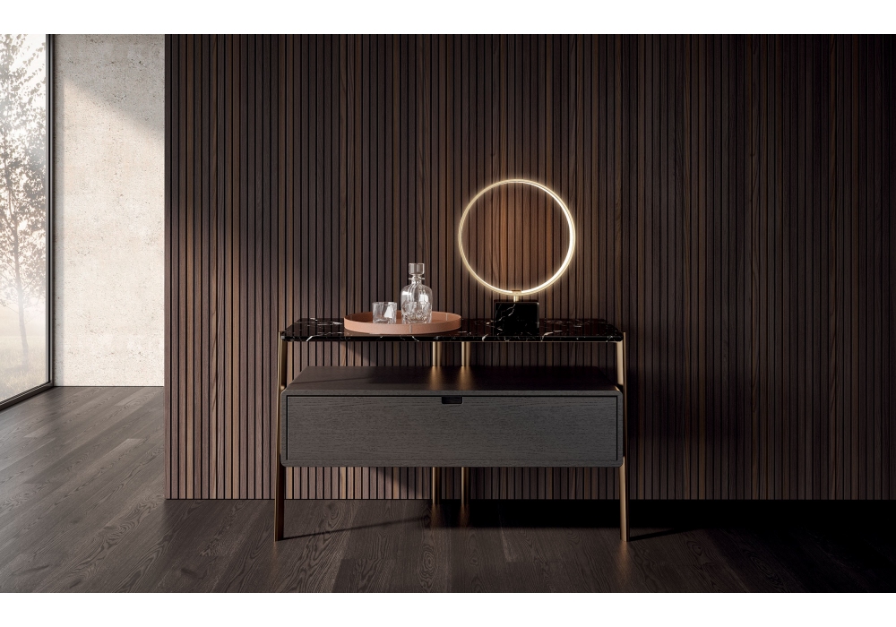 Eros conçue par Studio 63 pour MisuraEmme est une commode réalisée avec une structure en métal peint en bronze, un récipient en chêne noir et un plateau en marbre.