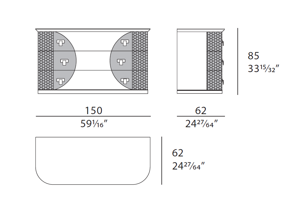 Vogue conçue par Andrea Bonini pour Turri est une commode avec structure en MDF, contreplaqué et panneaux de particules en finition laquée brillante. Il y a trois tiroirs avec doublure intérieure en microfibre, tandis qu'à l'extérieur, ils sont partiellement recouverts de cuir avec broderie hexagonale. Le dessus est en bois. À l'intérieur, il y a deux compartiments avec six étagères.