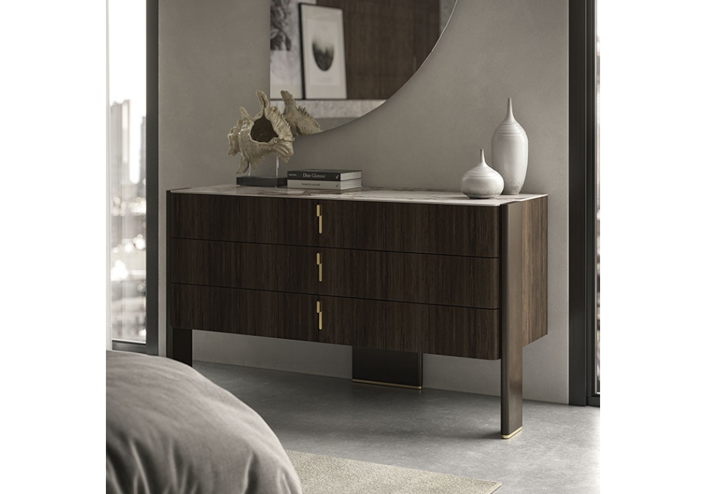 Julian conçue par Tosca Design pour Cattelan Italia est une commode à trois tiroirs en noyer Canaletto ou en chêne brûlé. Structure en bois peint en bronze gaufré et détails en acier peint en laiton. Plateau en céramique Marmi, en différentes finitions ou en verre miroir bronze.