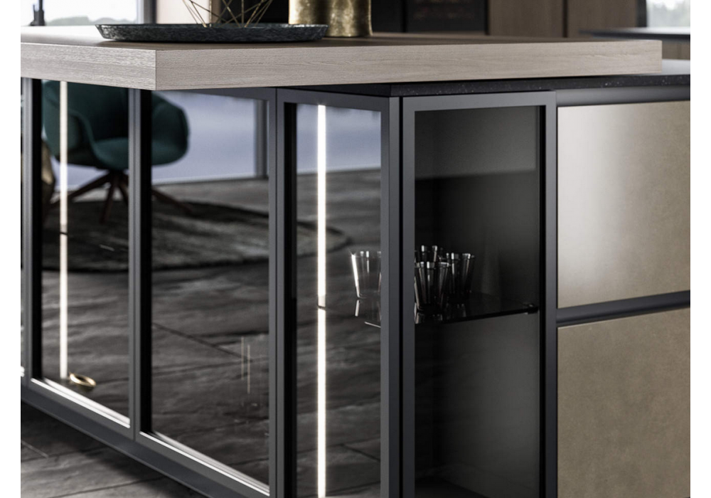 Rialto conçu par Snaidero est une vitrine conçue pour fusionner le coin cuisine avec le salon, les portes sont en verre fumé tandis que le cadre peut être personnalisé en différents matériaux. Le système d'éclairage intérieur des vitrines avec lumière verticale coupée au ras du côté du meuble évite l'éblouissement tout en mettant en valeur les aménagements intérieurs.
