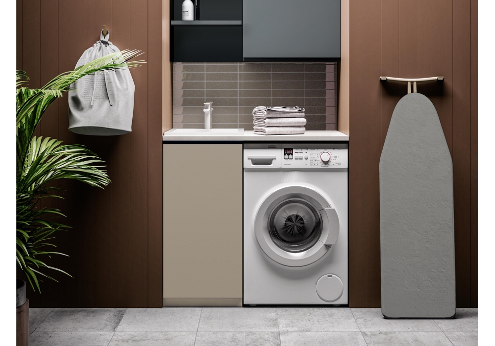 Idrobox conçu par Birex est un armoire à linge composé d'un élément haut laqué gris bleu mat avec un élément ouvert avec côtés en métal. Base de lavabo laquée corde mate avec vasque à poser. Élément ouvert laqué gris bleu mat avec côtés en métal.