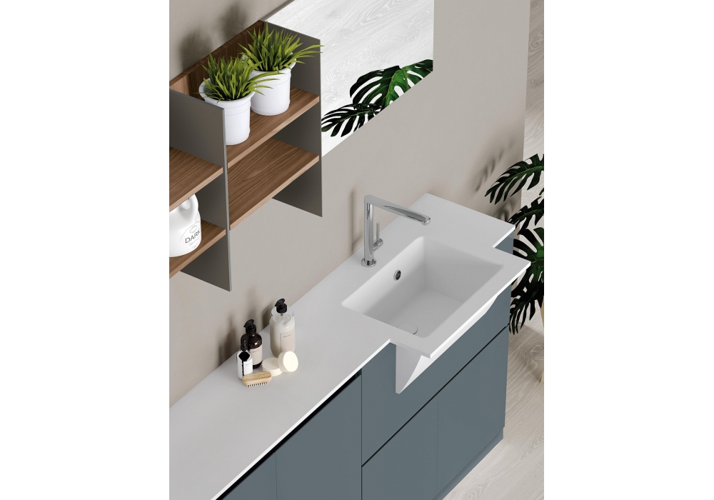 Idrobox conçu par Birex est un armoire à linge réalisé avec des colonnes laquées bleu-gris mat et un banc en noyer Alabama texturé. Bases laquées bleu-gris mat avec plateau en marbre minéral et vasque intégrée. Étagères en noyer Alabama texturé et côtés en métal titane.