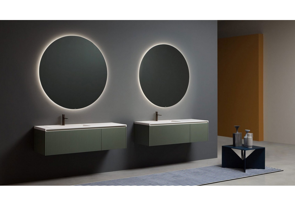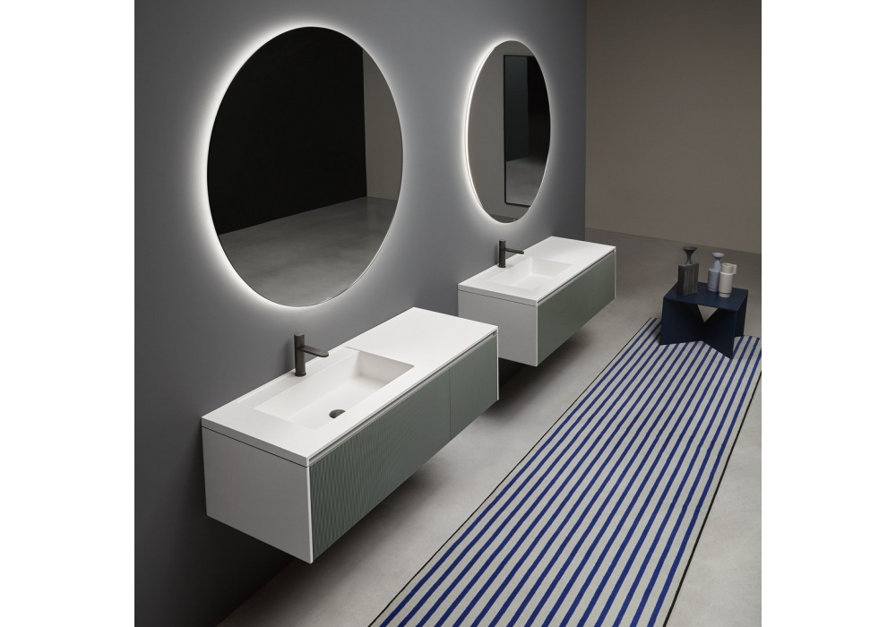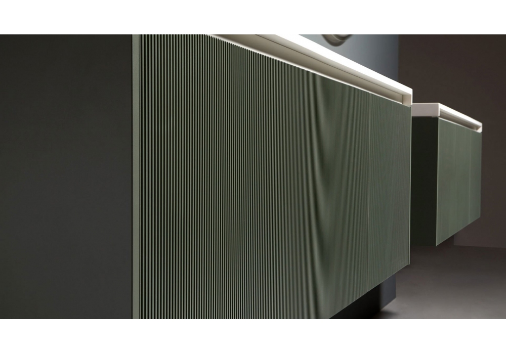 Binario conçue par Nevio Tellatin pour Antonio Lupi est une collection de meubles au style minimaliste et aux lignes épurées, caractérisée par un graphisme distinctif qui transforme les surfaces en décors géométriques. Les fraisages parallèles sur les façades et les côtés créent un effet tridimensionnel léger et raffiné. Elle est disponible en deux versions : Binario 03, avec des incisions de 3 mm, et Binario 12, avec des incisions de 12 mm. Les deux versions sont disponibles en bois ou laquées et s'associent parfaitement aux plateaux de la série Ponte, soulignant les volumes purs et fonctionnels et créant un jeu d'ombres qui enrichit l'esthétique du meuble.