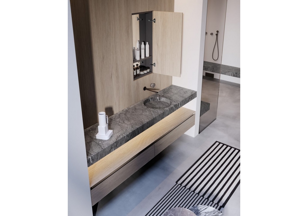 Fortepiano conçu par Antonio Lupi est un système de plans de travail en marbre massif alliant résistance et pureté formelle. Ce projet transforme la pierre en une surface homogène, sculptée par des vasques rondes, ovales, carrées ou rectangulaires intégrées, où l'eau semble modeler la matière. Fortepiano peut être installé comme étagère ou intégré aux meubles de rangement Antonio Lupi, créant un dialogue raffiné entre textures et couleurs. Simple, puissant et élégant : une nouvelle façon d'interpréter le marbre comme protagoniste incontesté de la salle de bains.