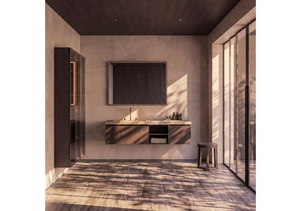 Hi-Line 6 conçu par Molteni&C est un système de salle de bains suspendu doté d'une base ouverte avec un plan de travail de 50 mm en travertin Rapolano et un lavabo intégré. Le profilé de poignée en aluminium finition étain apporte une touche graphique distinctive au design. Les colonnes suspendues, dotées de portes Flair en chêne café et verre fumé, offrent un espace de rangement léger et élégant. Le miroir Eidon rétroéclairé et la robinetterie Flora complètent l'espace vasque, pour un style raffiné et contemporain.
