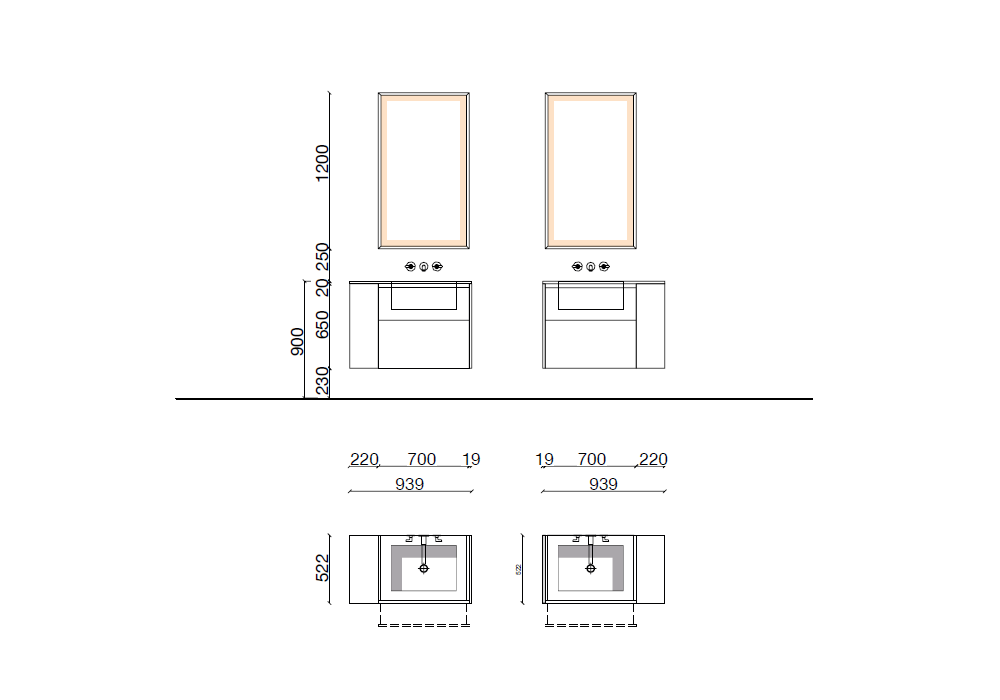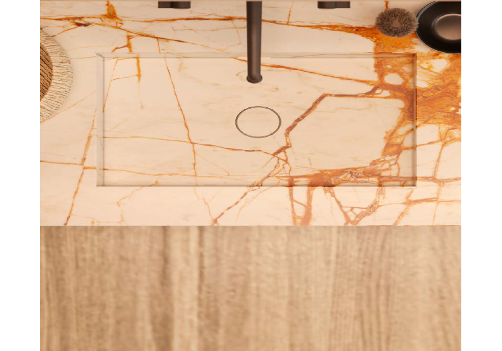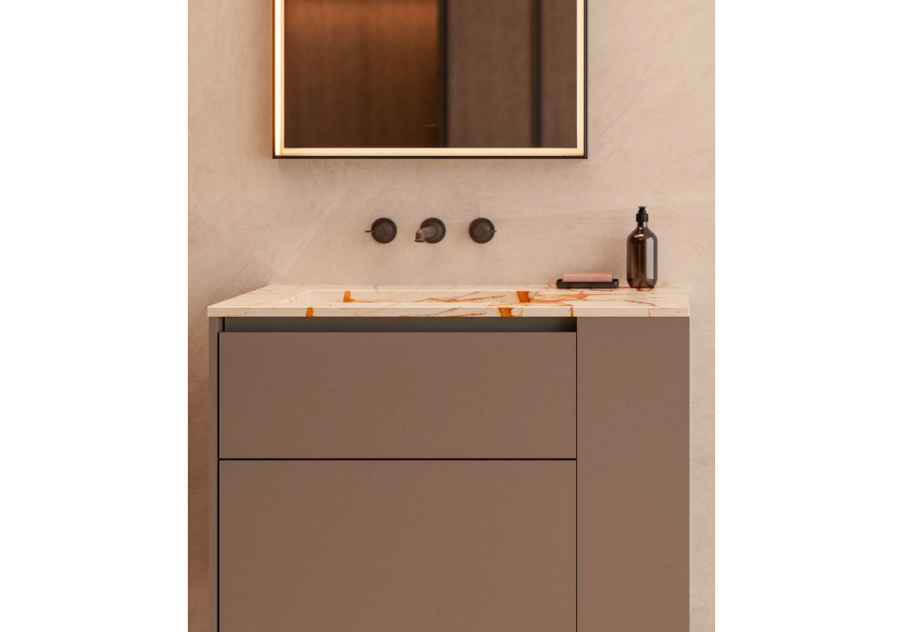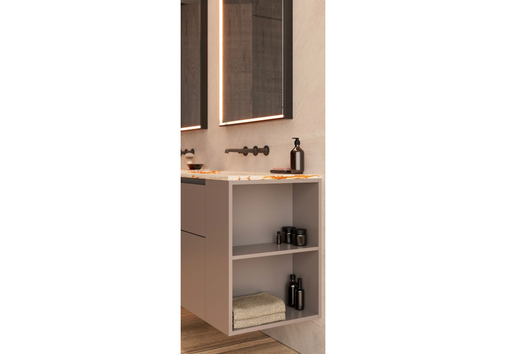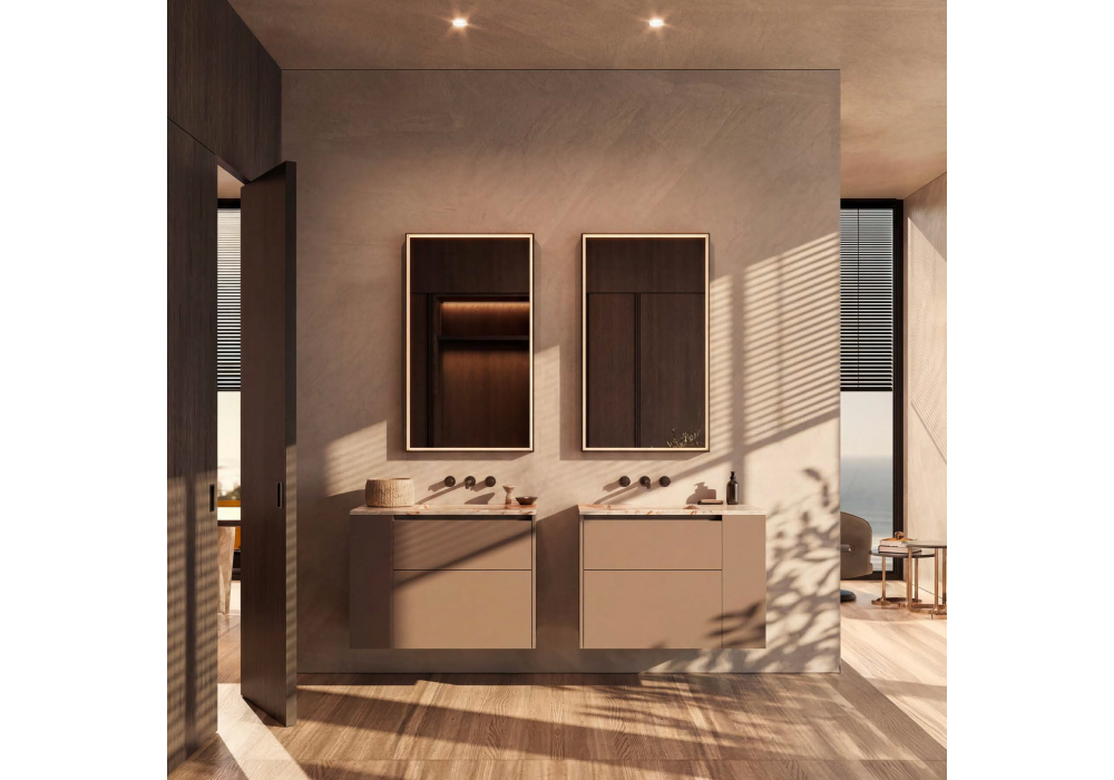 Hi-Line 6 conçu par Molteni&C est un système de salle de bains suspendu divisé en deux zones distinctes avec des bases laquées en dolomite mate et des éléments latéraux ouverts. Le plan de travail en marbre blanc des Maldives de 20 mm intègre les vasques, créant une surface harmonieuse et raffinée. Deux miroirs Eidon rectangulaires rétroéclairés complètent l'ensemble et soulignent l'équilibre de la composition. Robinetterie Flora.