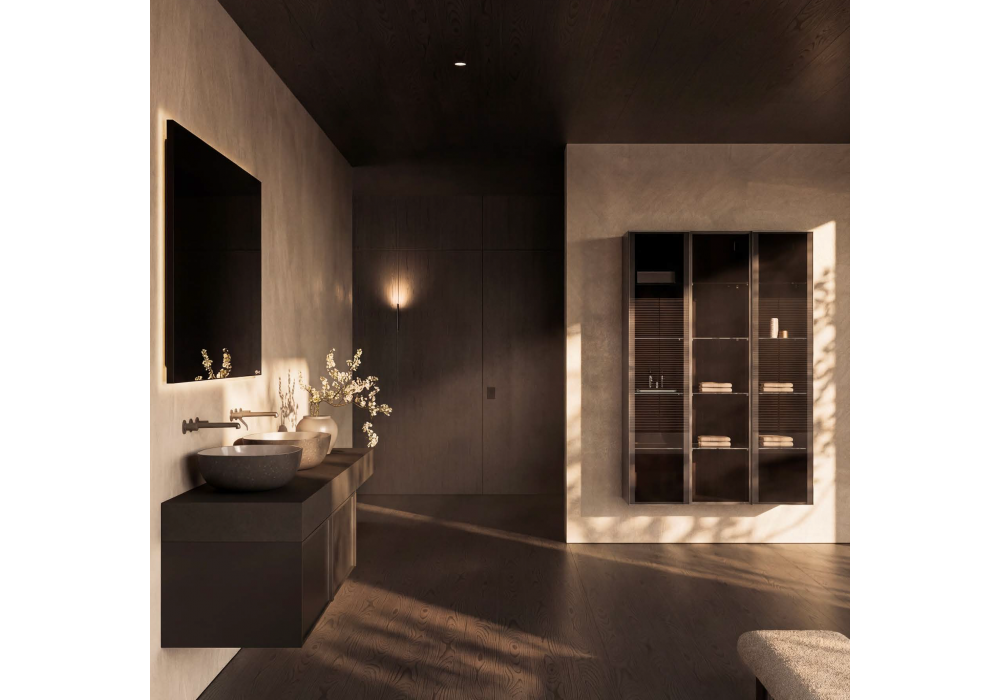 Ratio conçu par Vincent Van Duysen pour Molteni&C est un système de salle de bains aux tons sombres et sophistiqués, comprenant des éléments bas muraux Ratio en chêne noir et un plan de travail en pierre de lave partiellement suspendu de 150 mm. Les vasques à poser Ero, avec leur extérieur en pierre de lave et leur intérieur à effet craquelé, créent un élégant contraste de textures. Le mur est complété par des colonnes suspendues intégrant des modules en verre et des portes Flair, le tout sublimé par un éclairage vertical. Un miroir rectangulaire rétroéclairé et des robinets Flora délimitent l'espace lavabo, tandis que la banquette Tibeau apporte une touche de confort et d'élégance.