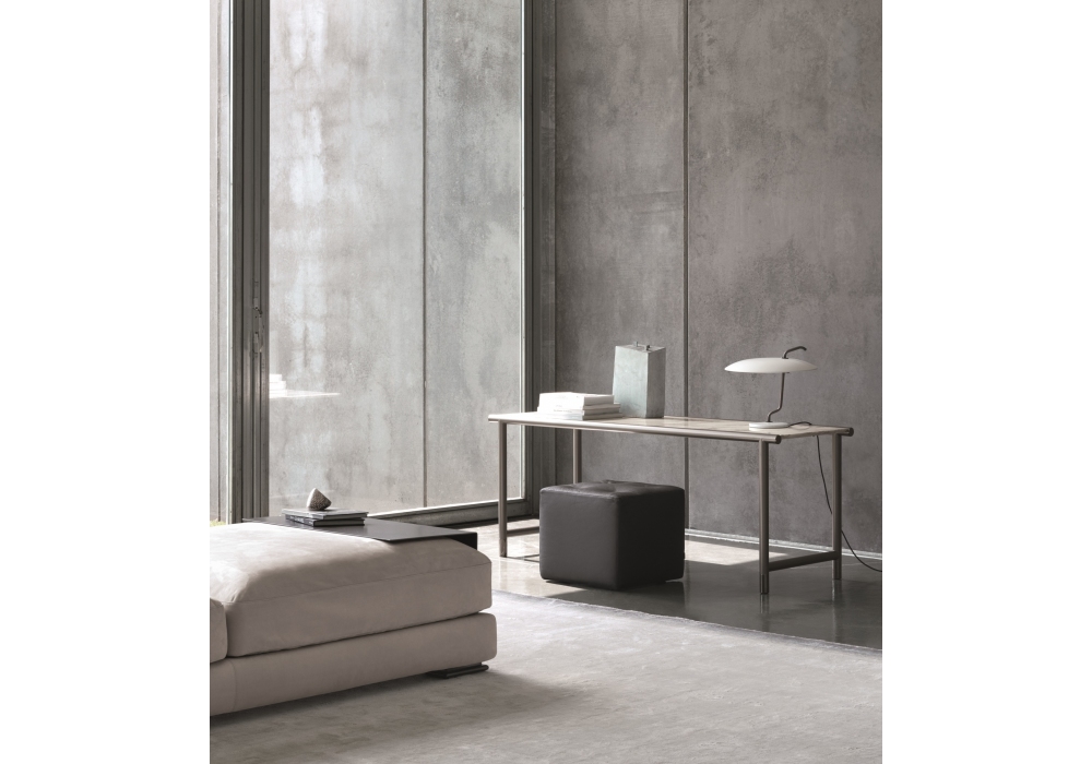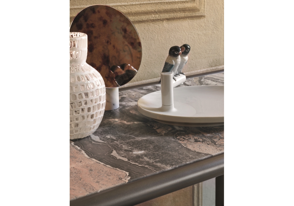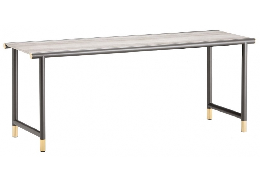 Iko conçue par Rodolfo Dordoni pour Flou est une console avec structure en tubes d'acier disponible en bruni mat. Détails en or brillant ou en nickel noir brillant. Plateau en ébène ou en marbre.