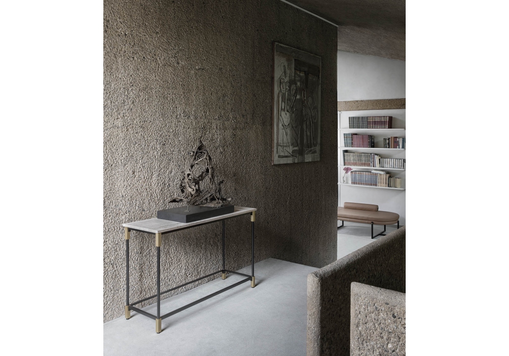 Match conçue par Bernhardt & Vella pour Arflex est une console avec structure en métal laqué noir mat et articulations en laiton. Plateau en marbre ou travertin.