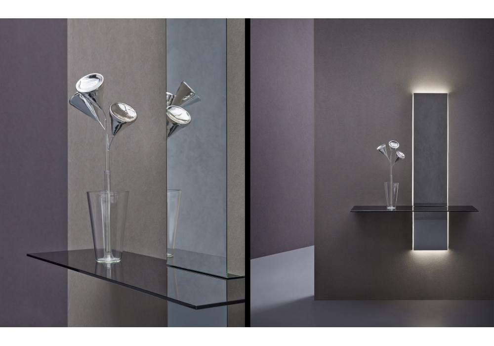 Peak conçue par Pinuccio Borgonovo pour Natevo est une console avec miroir. On peut être utilisée comme étagère mais surtout comme source de lumière grâce aux Led qui éclairent discrètement le plafond et le sol. Le plateau en verre ou en marbre donne à la console un aspect très contemporain.
