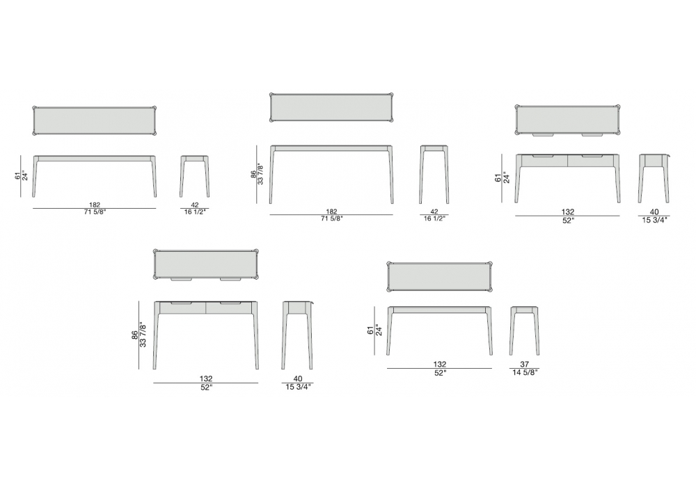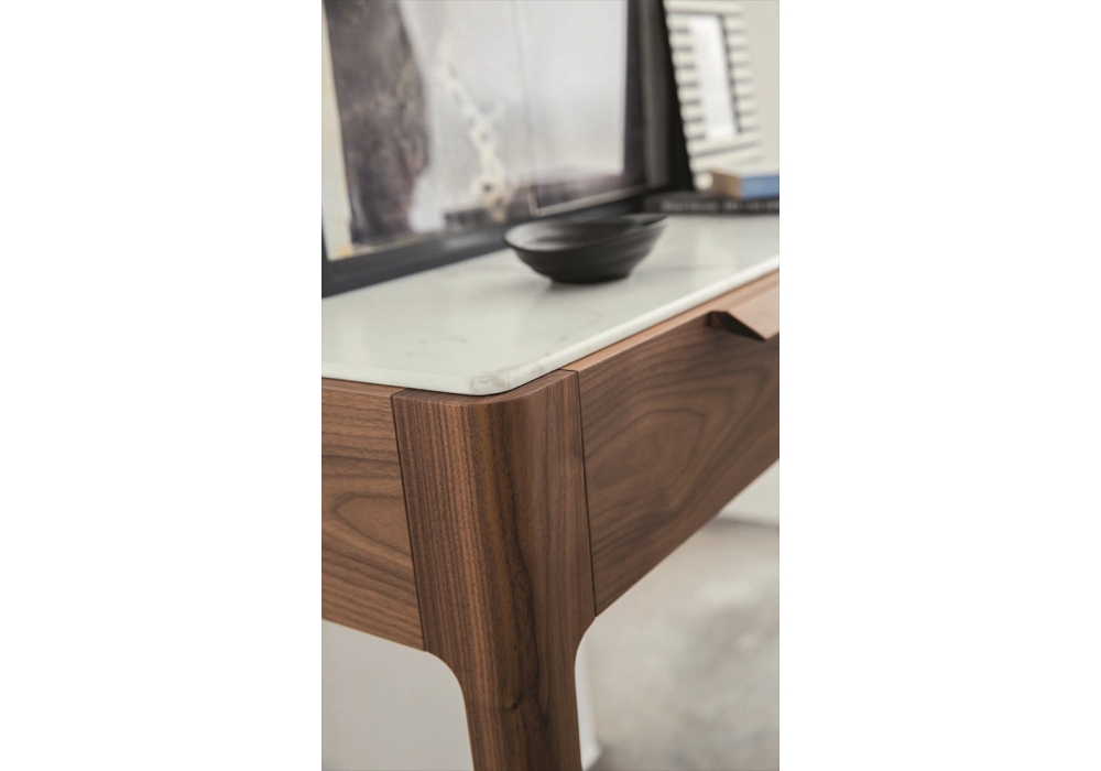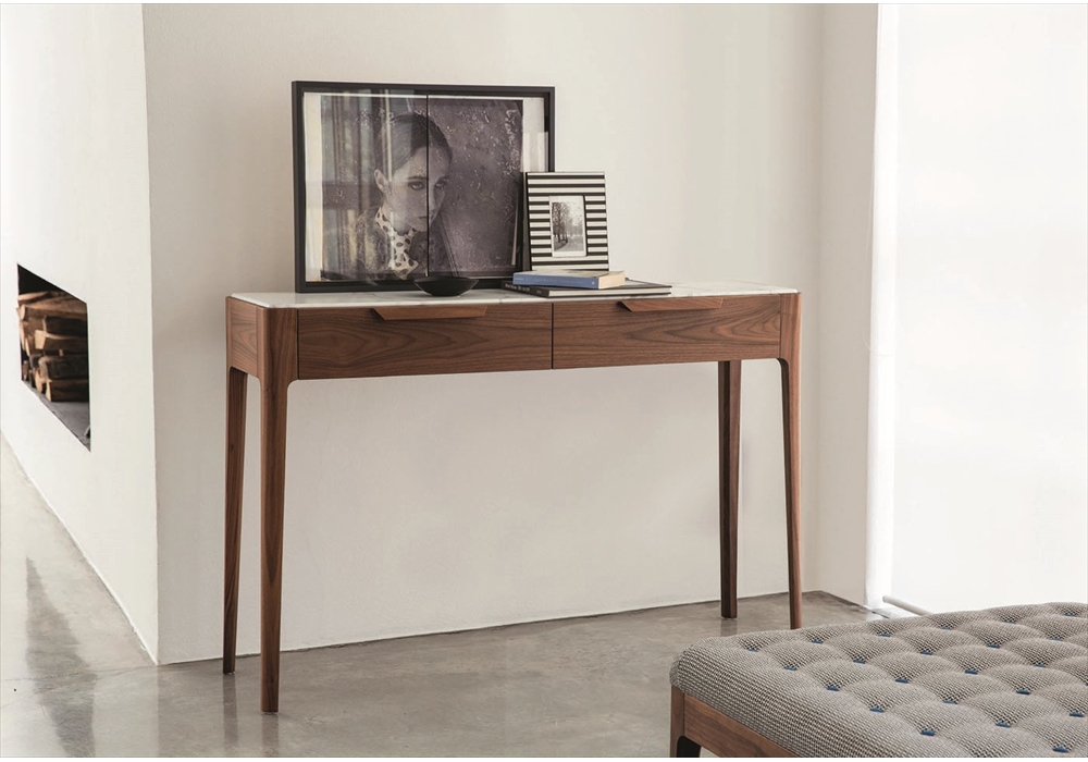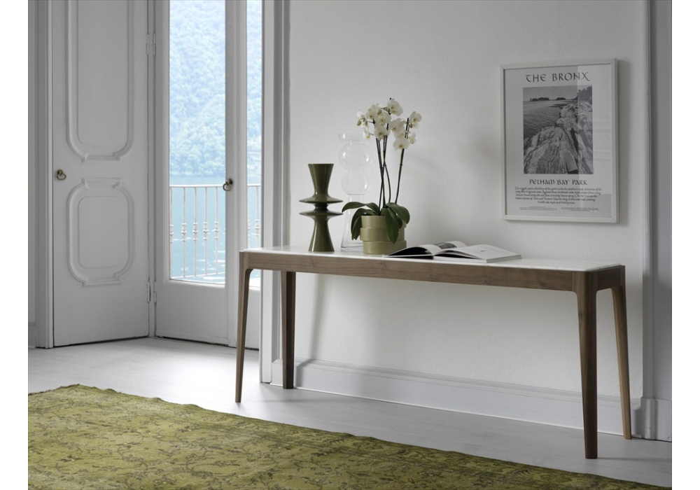 Ziggy conçue par Carlo Ballabio pour Porada est une console avec structure en noyer canaletta massif disponible en différentes finitions. Plateau en marbre, bois ou verre dépoli rétro verni. Disponible en différentes modèles.