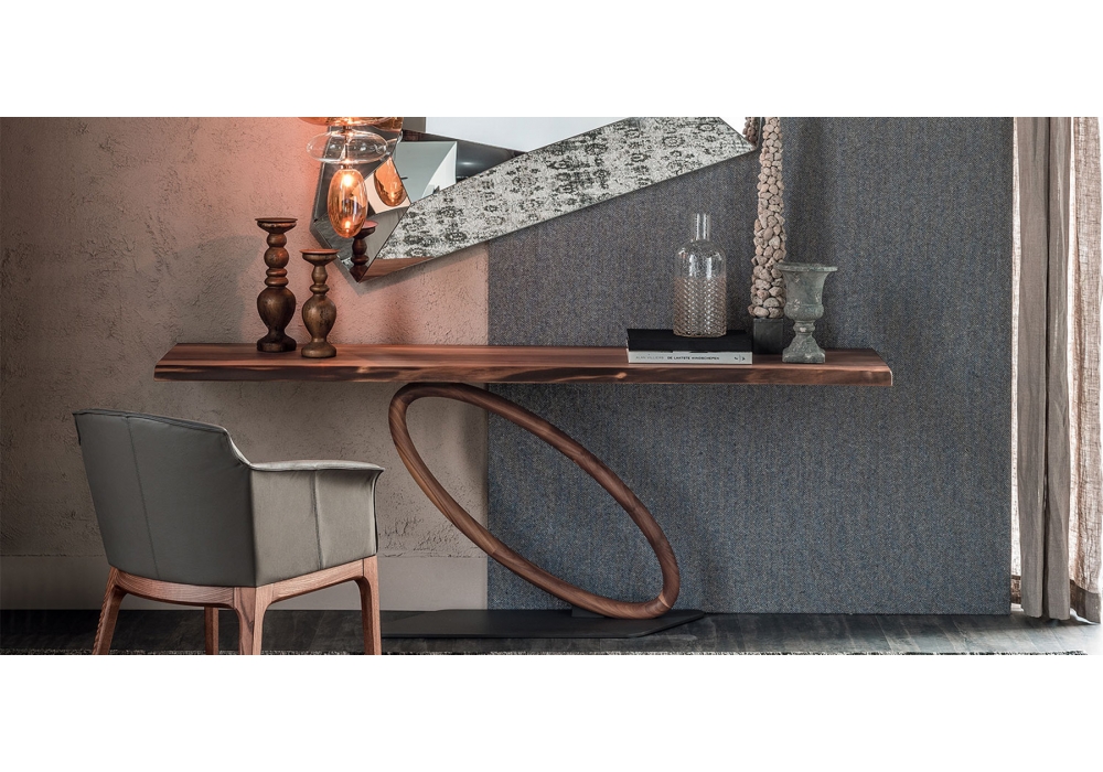 Tour conçue par Giorgio Cattelan pour Cattelan Italia est une console murale avec base en acier laqué gaufré graphite. Jambe et plateau en bois de noyer Canaletto. Disponible en deux dimensions. La différence de tonalité entre le plateau et la jambe est due au traitement différent.