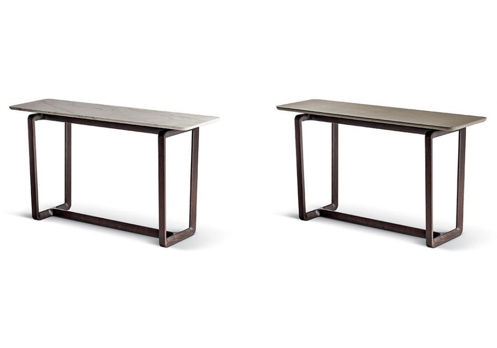 Fidelio conçue par Roberto Lazzeroni pour Poltrona Frau est une console avec base en bois massif de frêne avec une caractéristique section triangulaire. Plateau disponible en cuir Saddle Extra ou marbre.
