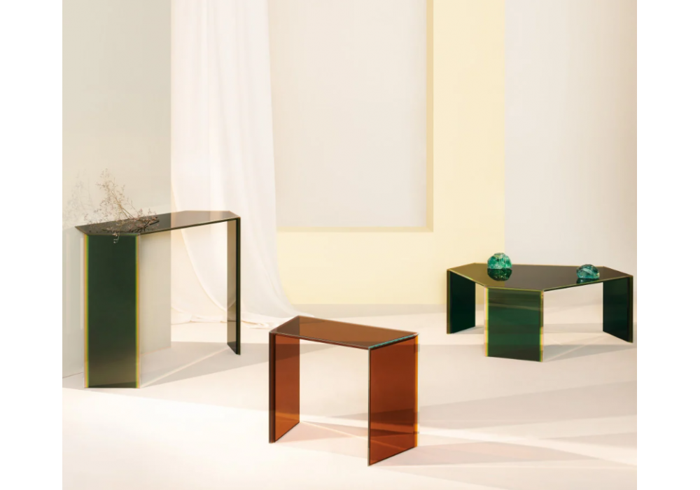 Bisel conçue par Patricia Urquiola pour Glas Italia est une console réalisée en verre multicouche et multichromatique, obtenue en superposant cinq dalles de verre extralight mm. 5 avec des films de couleurs différentes. Disponible en 2 modèles.