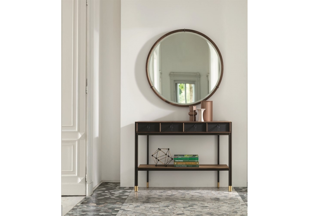 Bayus 8 conçue par G. & O. Buratti pour Porada est une console avec cadre en noyer canaletta. Base en métal avec finition Bronzoro et embouts en laiton brossé. Proposée avec quatre compartiments avec la possibilité d'insérer quatre tiroirs. Disponible dans une seule dimension.