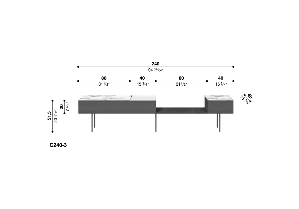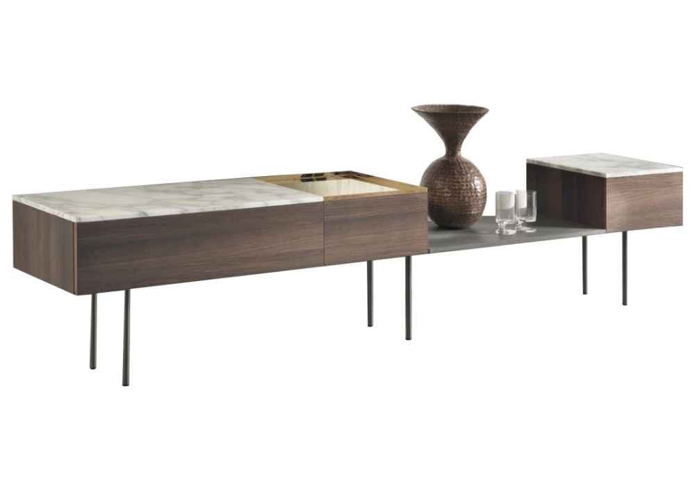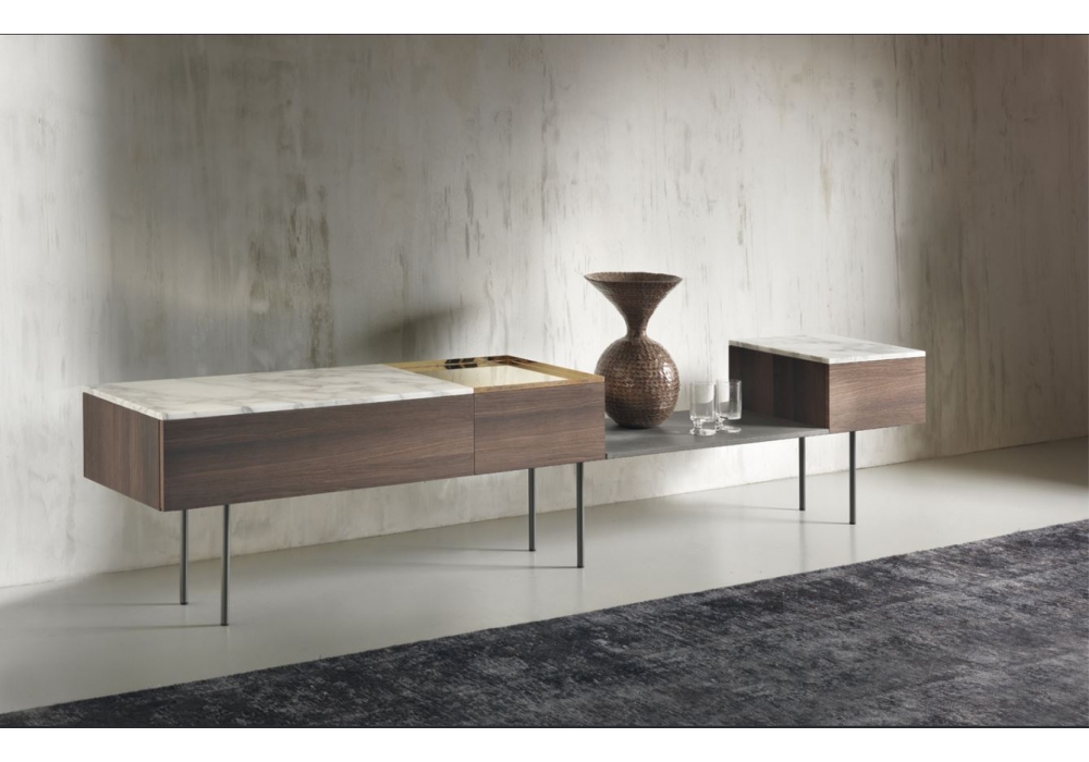 Moodboard Console conçue par Massimo Mariani pour Acerbis est une console basse modulable en pieds gris foncé vernis mat, plateau en bois ou marbre, et plateau de service disponible en acier poli ou finitions laiton. La structure est dans la même finition que le plateau en bois choisi.