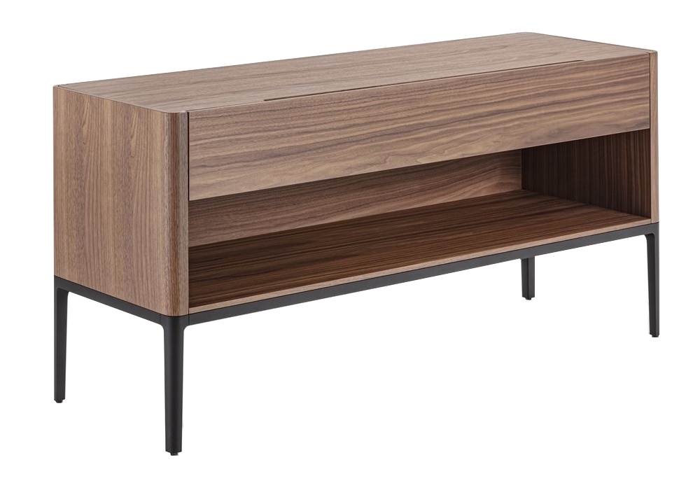 Nara 4 conçue par D. Dolcini pour Porada est une console pour le dossier du canapé avec tiroir en noyer canaletta et structure en aluminium peint noir mat.