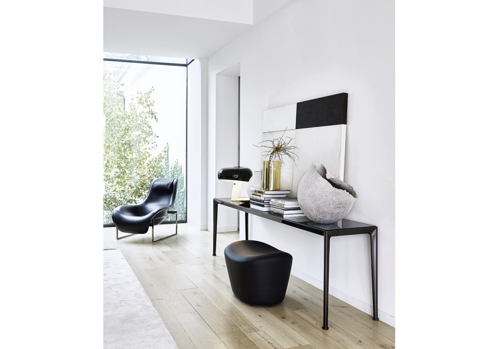 Mirto Indoor conçu par Antonio Citterio pour B&B Italia est une collection de consoles avec structure en aluminium moulé sous pression et extrudés d'aluminium verni étain ou verni chromé noir. Plateau disponible en eucalyptus frisé brillant, panneau de fibre de bois MDF plaqué chêne, verre ou marbre. Disponible en trois dimensions.