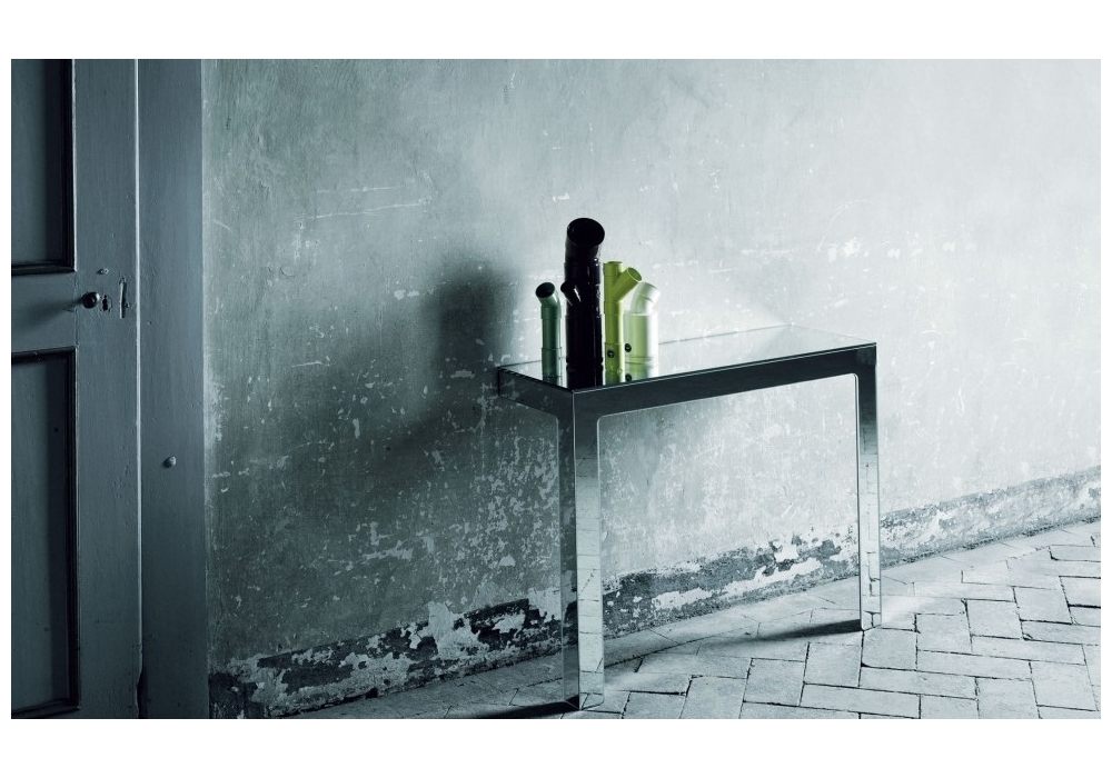 Mirror Mirror conçu par Jasper Morrison pour Glas Italia est une console disponible en différentes tailles, dont la base est réalisée en collant à 45° des feuilles de miroir stratifié double face, découpées au jet d'eau. Le dessus repose sur la base.