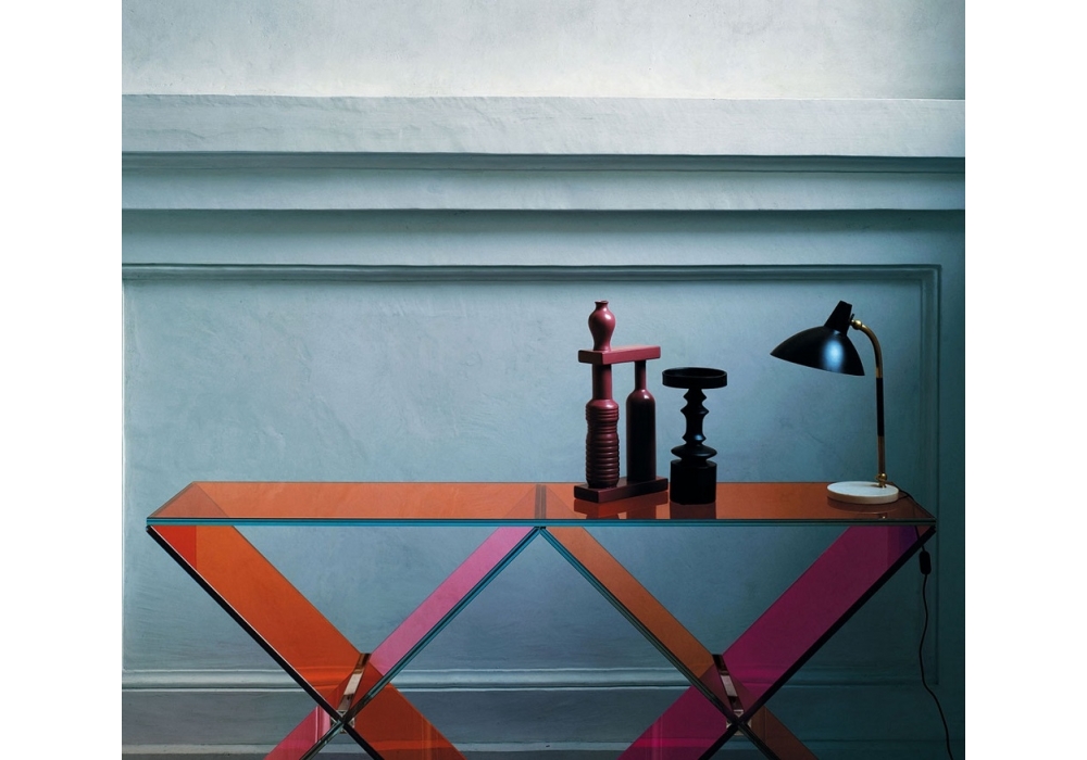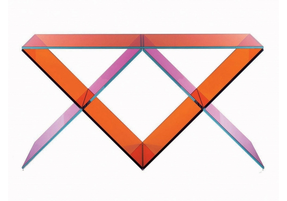 XX conçue par Johanna Grawunder pour Glas Italia est une console en verre transparent rose et orange. La base composée de deux X en 8 + 8 mm trempé et stratifié.Le verre, avec des biseaux et des collages spéciaux, est agrémenté d'éléments en métal chromé poli. Le plateau, en verre stratifié 8 + 8 mm, repose sur la base.