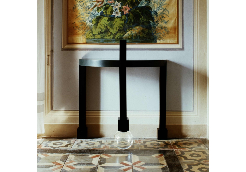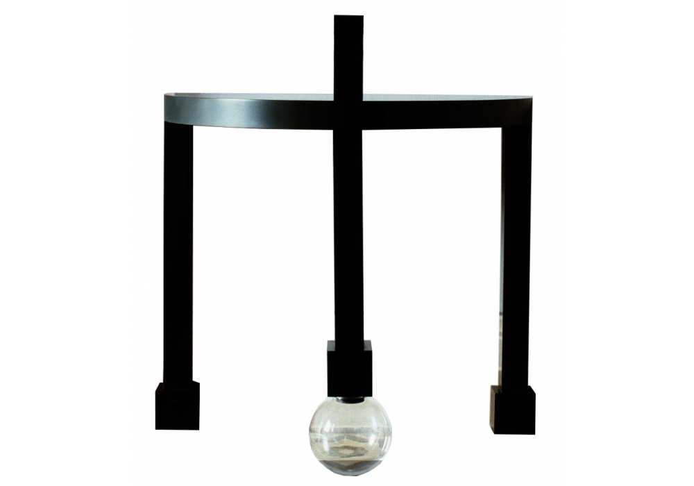 Ellen conçue par Bill Woodrow Memphis Milano est une console en bois laqué noir avec sphère en plexiglas. Édition limitée de 25 pièces.
