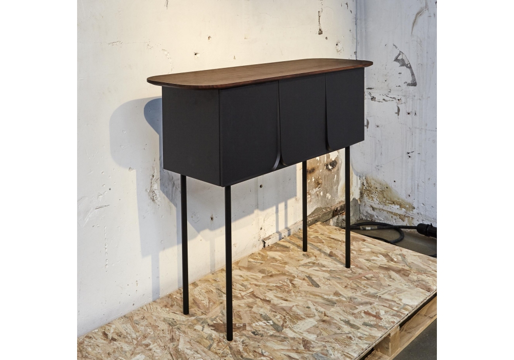 Aube conçue par Valentine Maupetit pour Ligne Roset est une console avec base en acier laqué noir; coffres, portes en frêne massif teinté noir et plateau en noyer américain massif.
