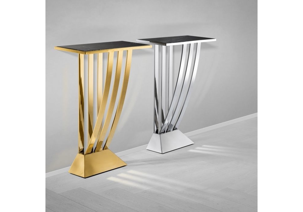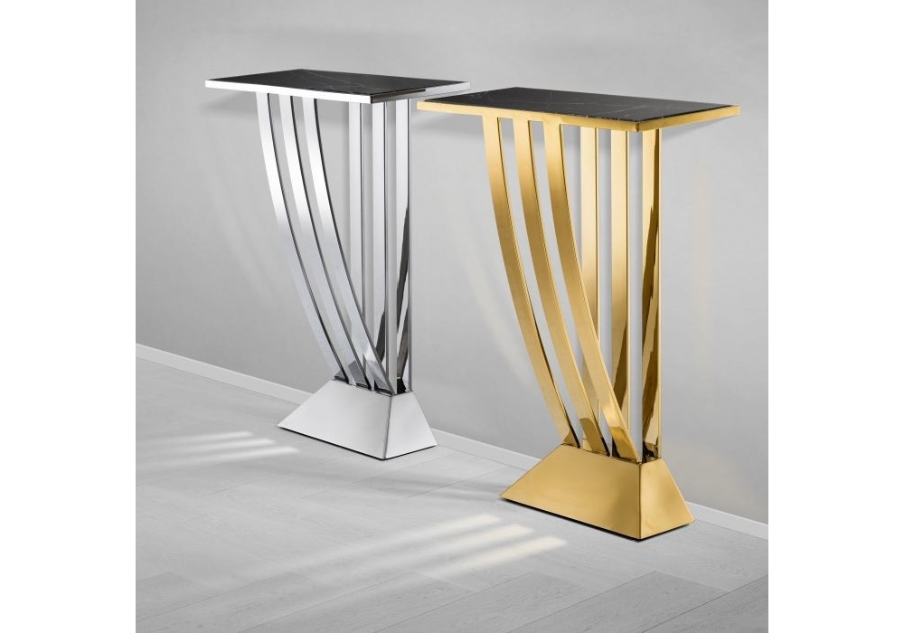 Console Table Beau Deco conçue par Eichholtz est une console qui comprend une structure unique avec une base large et robuste et des lattes saillantes de chaque côté. L'étagère rectangulaire est en marbre noir. Disponible en différent finitions.