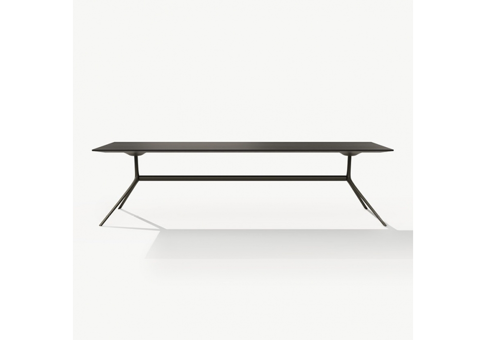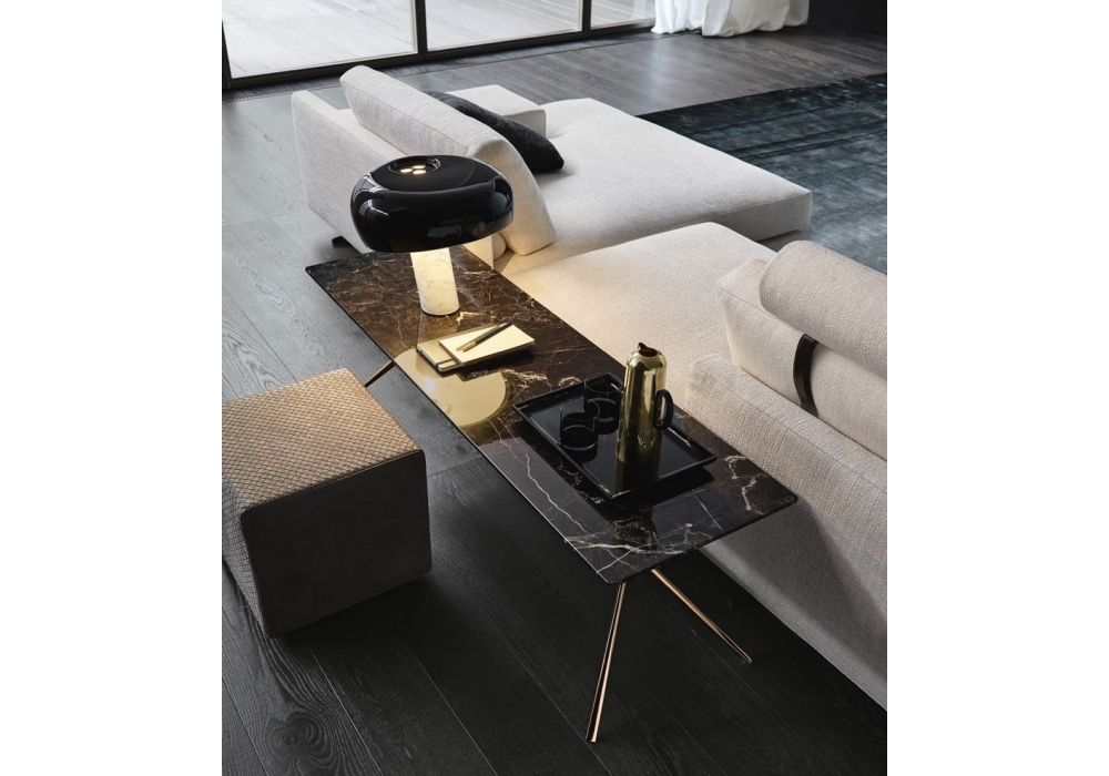 Mondrian conçue par Jean-Marie Massaud pour Poliform est une console composée d'une structure en bronze poli ou d'aluminium peint et d'un plateau en panneau de fibres de moyenne densité plaqué, laqué ou en marbre. Il est disponible en deux tailles.