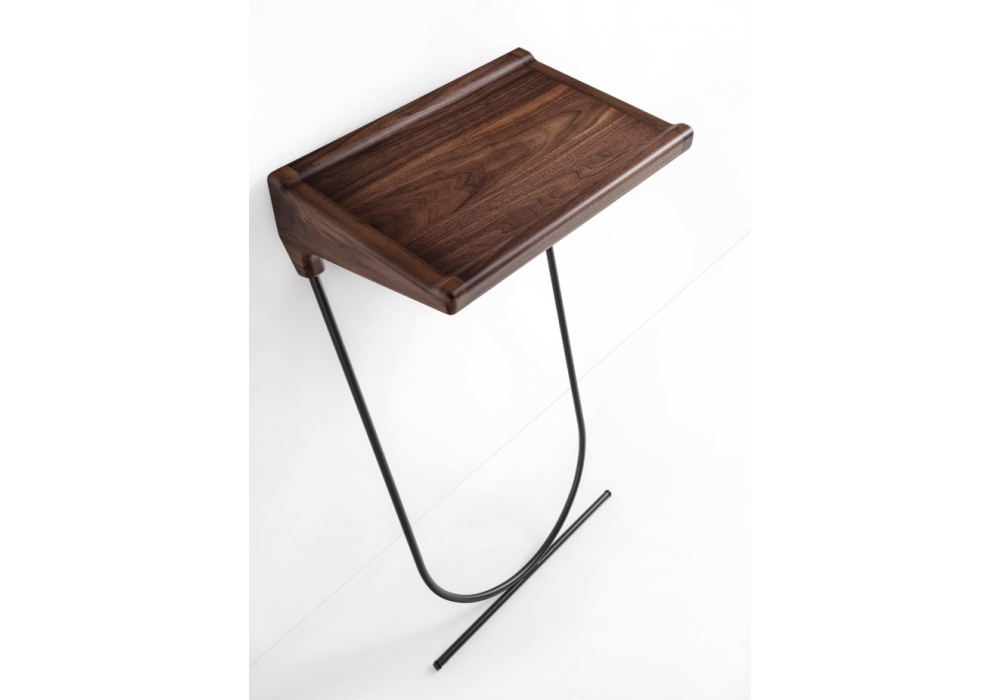 Maori conçue par Essetipi pour Porada est une console murale avec structure en métal gris étain et plateau en noyer Canaletta massif.