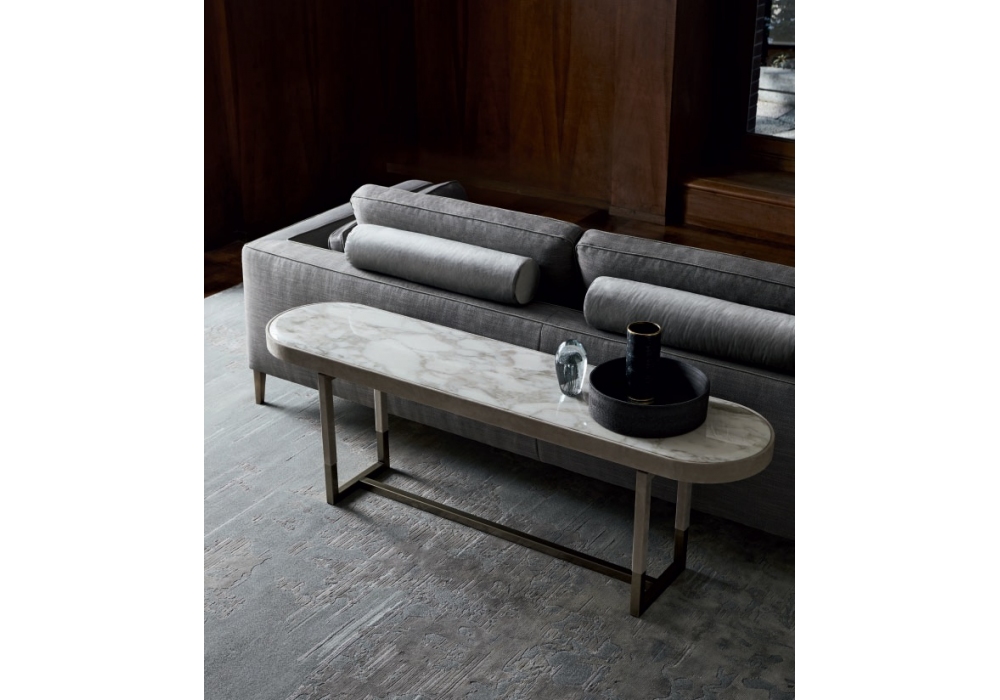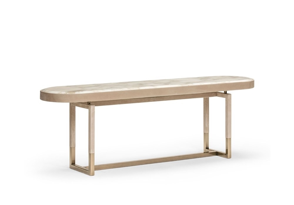 Isabel conçue par Castello Lagravinese Studio pour Opera Contemporary est une console recouverte de cuir avec structure en métal et plateau en marbre. Disponible en différentes finitions et dimensions.