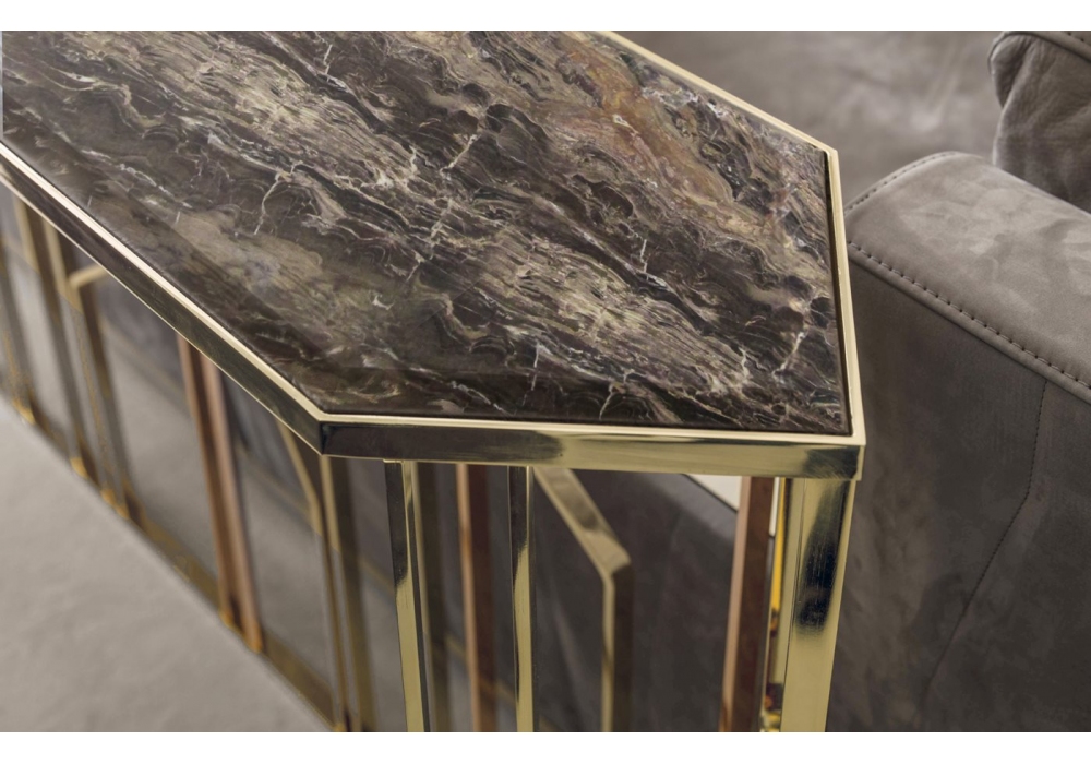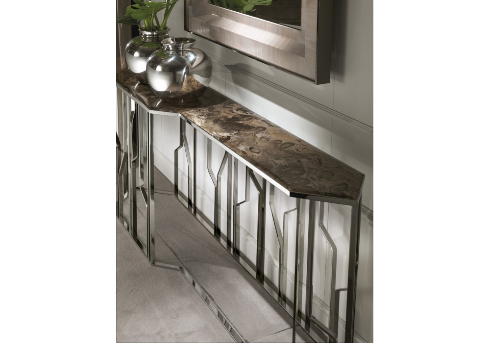 Ginza conçue par Alessandro La Spada pour Longhi est une console avec structure en métal brillant ou mat et plateau en marbre, miroir ou recouvert de cuir. Disponible en différentes dimensions.