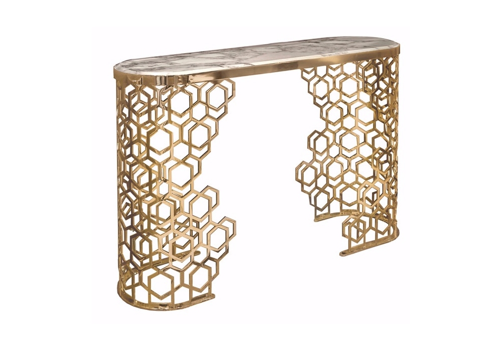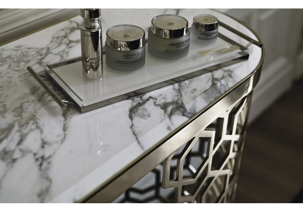 Manfred conçue par Giuseppe Iasparra pour Longhi est une console avec plateau en marbre, miroir ou cristal et structure en métal rectifié découpé au laser avec décoration Sequence. Disponible en différentes dimensions.