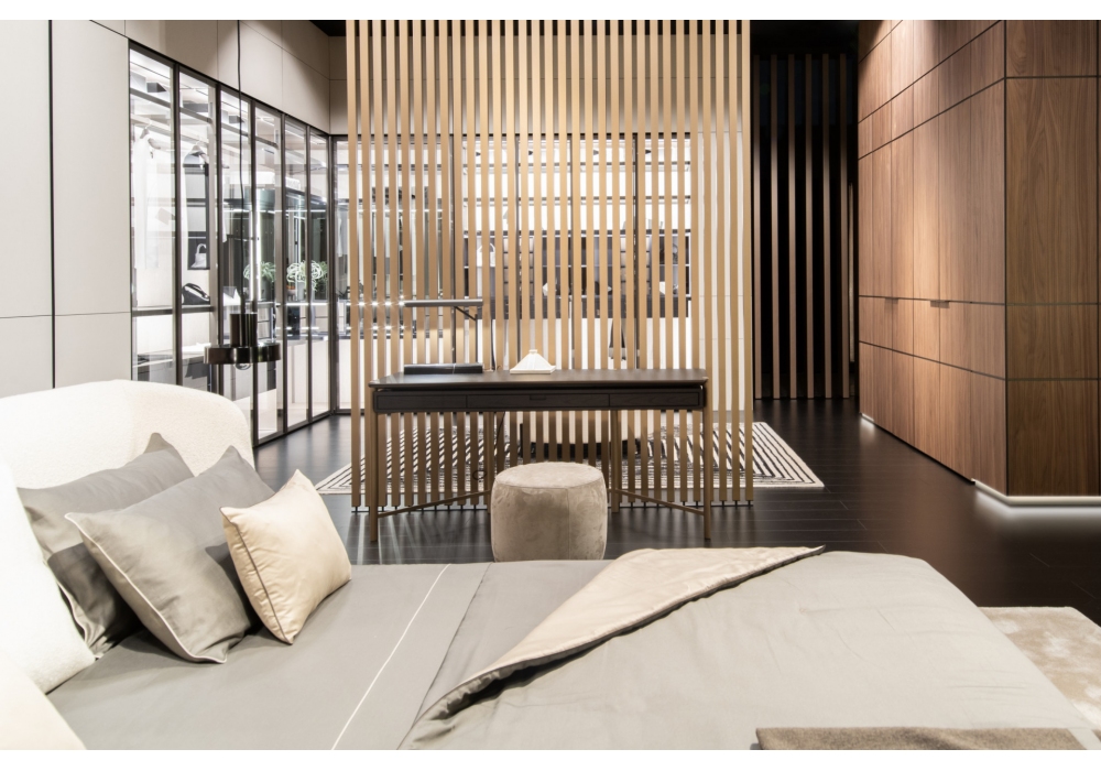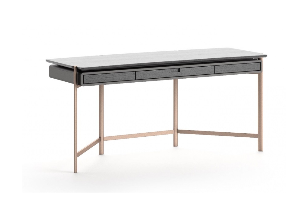 Eros conçue par Studio 63 pour MisuraEmme est une console réalisée avec structure en métal bronze doré, récipient en essence de chêne noir et plateau en marbre ou essence.