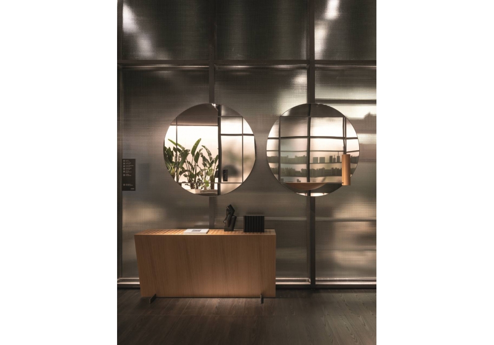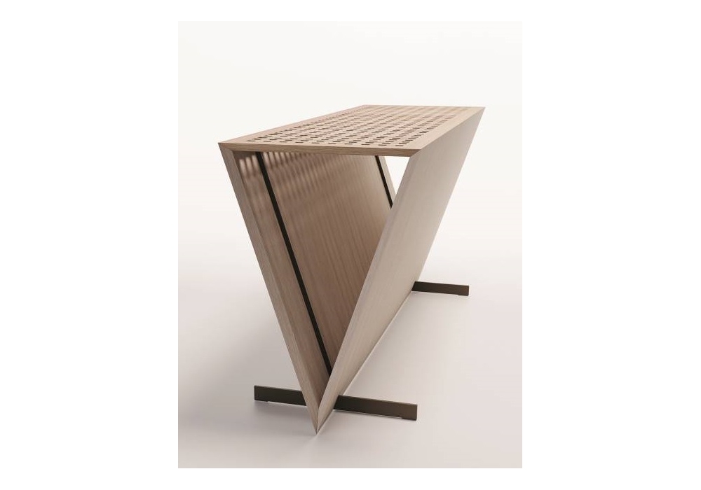 Alvea conçue par Marco Lavit pour Living Divani est une consolle triangulaire avec structure en tôle d'acier peinte avec des poudres époxy de couleur brunie, panneaux latéraux en MDF plaqué chêne et plateau composé d'éléments en chêne massif. Support au sol garanti par des supports en matériau thermoplastique.