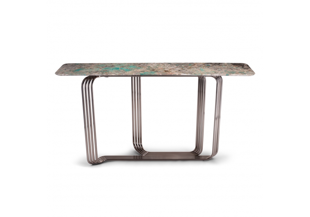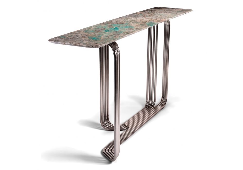 Vincent conçue par Alessandro La Spada pour Visionnaire est une console quadrangulaire avec base tubulaire en acier inoxydable. Le plateau est en marbre, verre trempé fumé, résine ou racine de noyer. Vincent est disponible en différentes finitions.