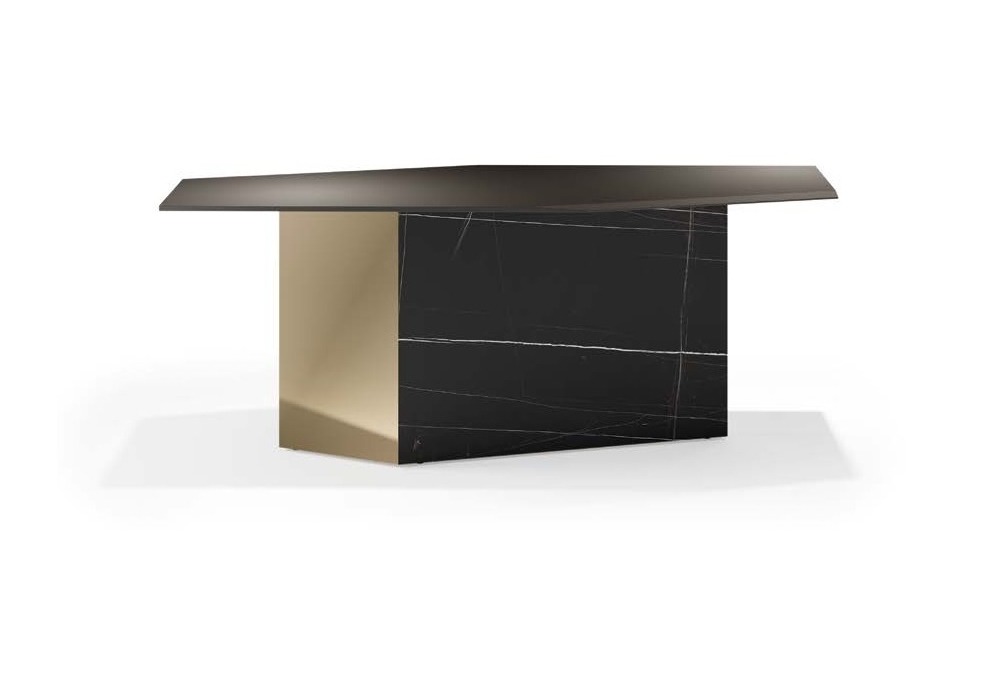 Cubitum conçue par Riccardo Lucatello pour Reflex Angelo est une console réalisée avec une base en bois et des bords en finition Bronze. Intérieur : côté long en miroir bronze, côté court en Marmoreflex. Extérieur : côté court en miroir bronze, côté long en Marmoreflex.