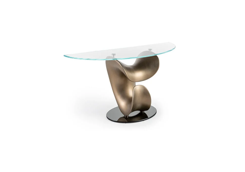Parentesis conçue par Tulczinsky pour Reflex Angelo est une console avec base en finition satinée: laiton, laiton foncé, titane et base en verre miroir fumé. Plateau semi-circulaire en verre extra-clair.