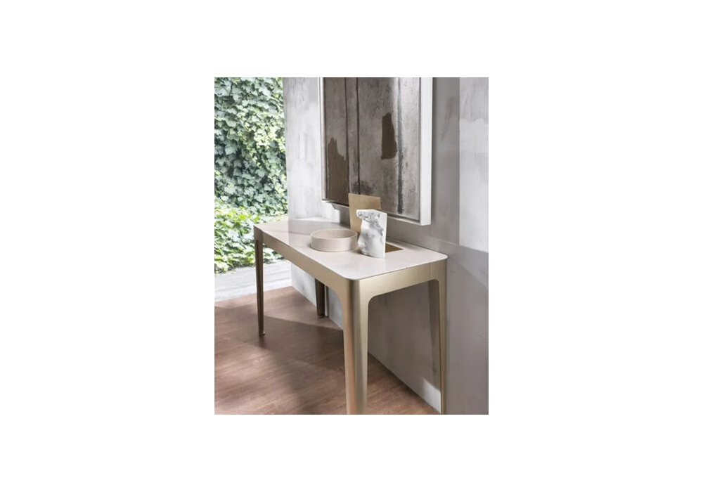 Minimal conçu par Riflessi est une console en métal plié sous pression et verni avec une finition brossée à la main ou avec un vernis à effet tibétain brossé à la main.