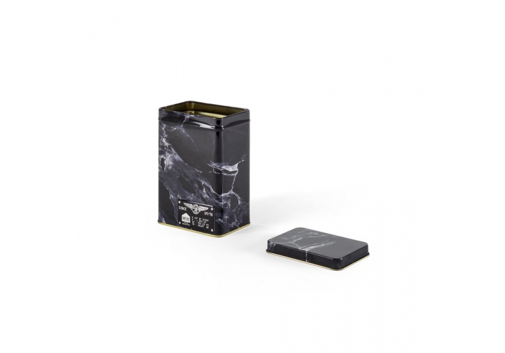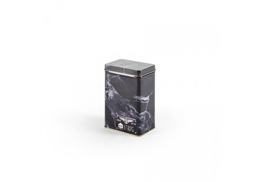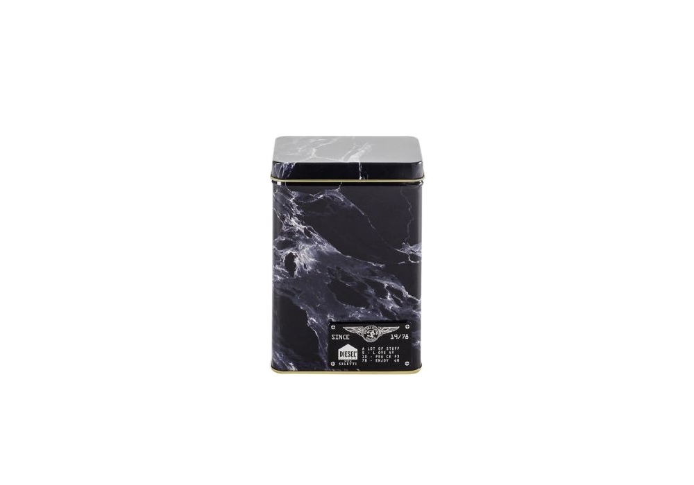 Diesel Alumarble conçue et réalisée par Diesel Living avec Seletti est une boîte en métal noir aux imprimés colorés.