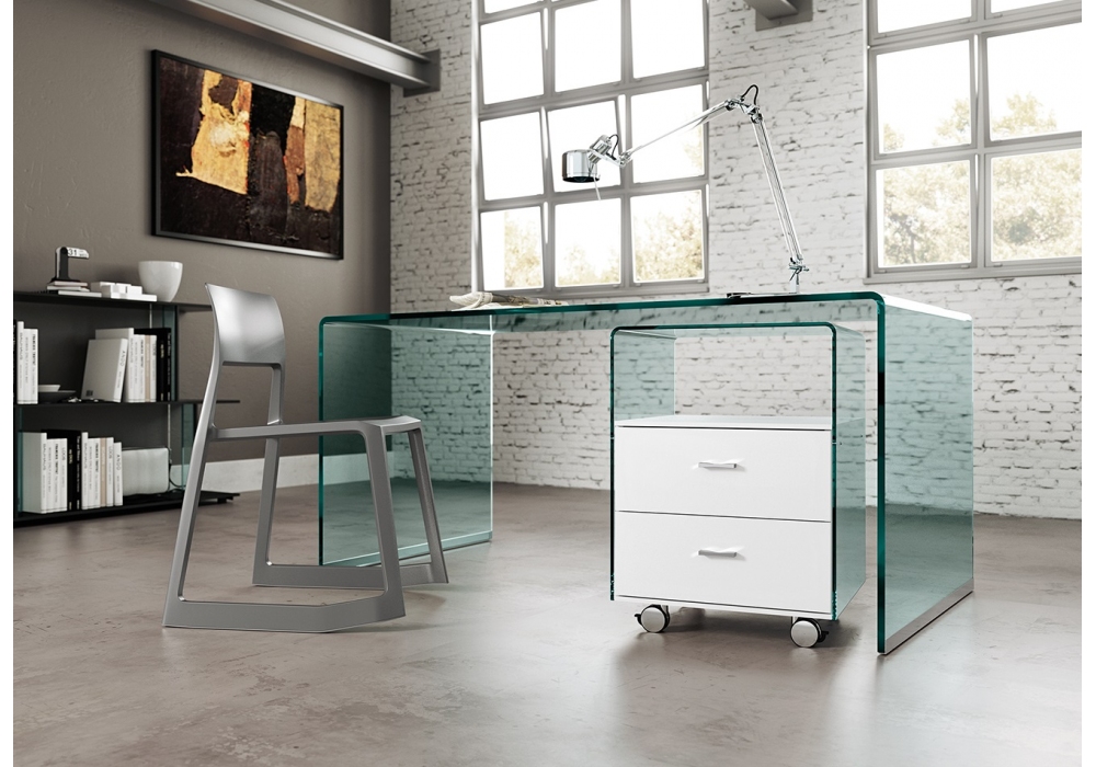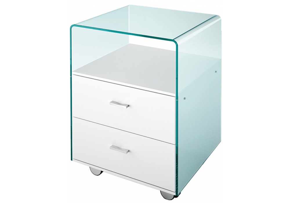 Rialto conçu par CRS Fiam est une meuble à tiroirs en verre cintré transparent de 8 mm. La structure des tiroirs est en bois laqué blanc. Le meuble à tiroirs est doté de 2 tiroirs avec système de fermeture automatique amortie. Roulettes et poignées chromées.