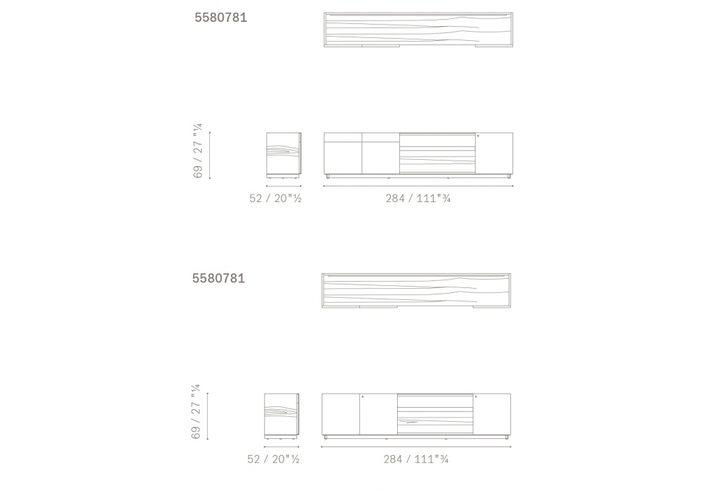 La structure du Low Cabinet est en panneau de MDF recouvert d’un placage en Rouvre couleur plomb ou Rouvre couleur tabac, avec finition mate sauf pour le dessus, dont la finition est brillante. La base est en acier satiné peint de couleur plomb, les pieds sont réglables et la traverse centrale de connexion est peinte en noir texturisé anti-rayures. Le dos du Cabinet possède un volet rabattable qui permet d’accéder à un petit compartiment interne servant à la sortie des câbles, qui montent du sol jusqu’au dessus en suivant la fente située tout le long du plan de travail. La préparation pour le passage des câbles est fournie et personnalisée en fonction des dispositifs d’électrification choisis et spécifiés par le client au moment de l’achat. Ces dispositifs doivent être achetés et installés par le client après la livraison. Pour garantir que cette préparation soit faite correctement en phase de production, il est recommandé d’envoyer un échantillon. Le Low Cabinet est disponible en deux longueurs, 230 cm et 284 cm, avec deux variantes disponibles pour chaque dimension. La première version est équipée, du côté gauche, de 2 tiroirs et 2 classeurs à extraction totale et retour amorti, avec façade revêtue de cuir Pelle Frau® du Color System et structure interne peinte en noir texturisé anti-rayures. Dans ce cas la dimension de 230 cm offre, sur la droite, un compartiment ouvert avec une étagère interne, tandis que la dimension de 284 cm a un compartiment central ouvert, et une porte, revêtue de cuir Pelle Frau® du Color System, à droite munie d’une serrure à clef située sur le devant. La deuxième version du Cabinet est équipée, dans la version de 284 cm, de 3 portes et d’un compartiment central ouvert muni d’une étagère, et dans la version de 230 cm, de 2 portes et d’un compartiment ouvert sur le côté droit. Les portes sont toujours revêtues de cuir Pelle Frau® du Color System et munies de serrures à clef situées sur le devant : deux serrures dans le cas du Cabinet de 284 cm (une pour les deux portes de gauche, et une pour la porte de droite), et une serrure dans le cas de la dimension 230 cm (située sur la porte de droite, pour fermer les deux volets).