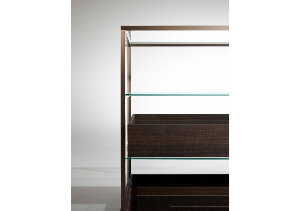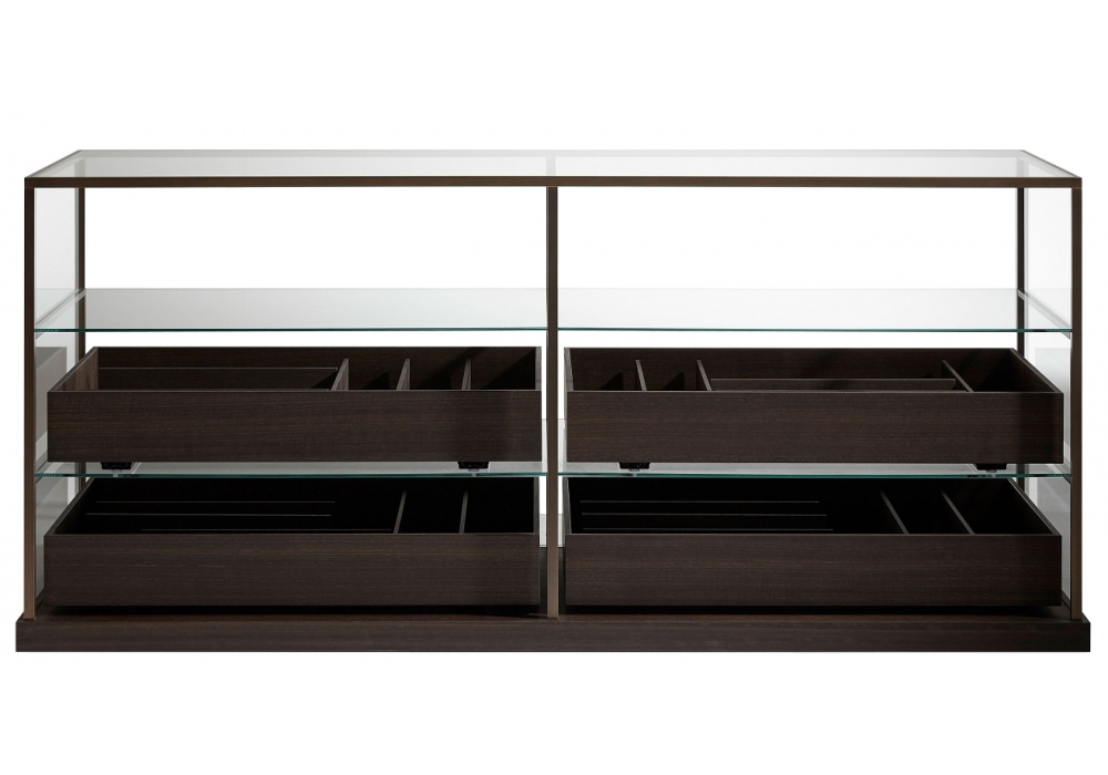 Ideal both for the home as well as for the most elegant shops, Acquario designed by Piero Lissoni for Porro is the new central drawer unit, perfect in the middle of a room, made in transparent glass with metal profiles; it’s divided in 3 shelves and customizable with wooden trays, in order to leave the contents visible, store them in perfect order and then extract them with ease.